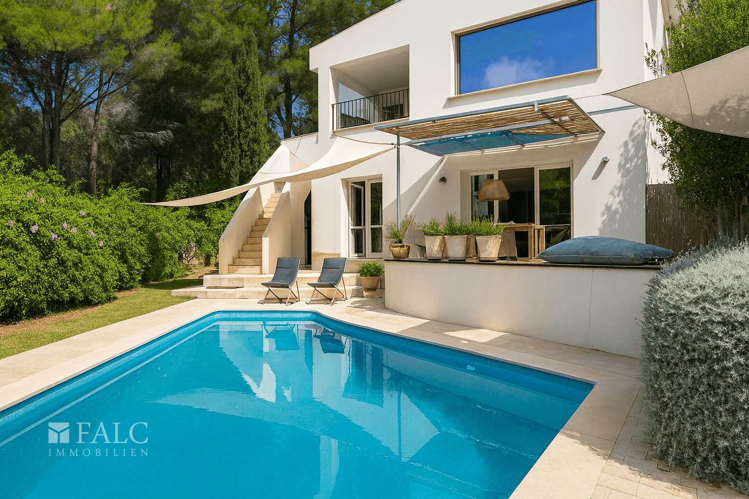 Im Außenbereich laden drei großzügige Terrassen und ein gepflegter Poolbereich zum Entspannen und Genießen ein. Der Garten ist grün umrahmt und bietet viel Privatsphäre. Ein Stellplatz ist ebenfalls vorhanden.