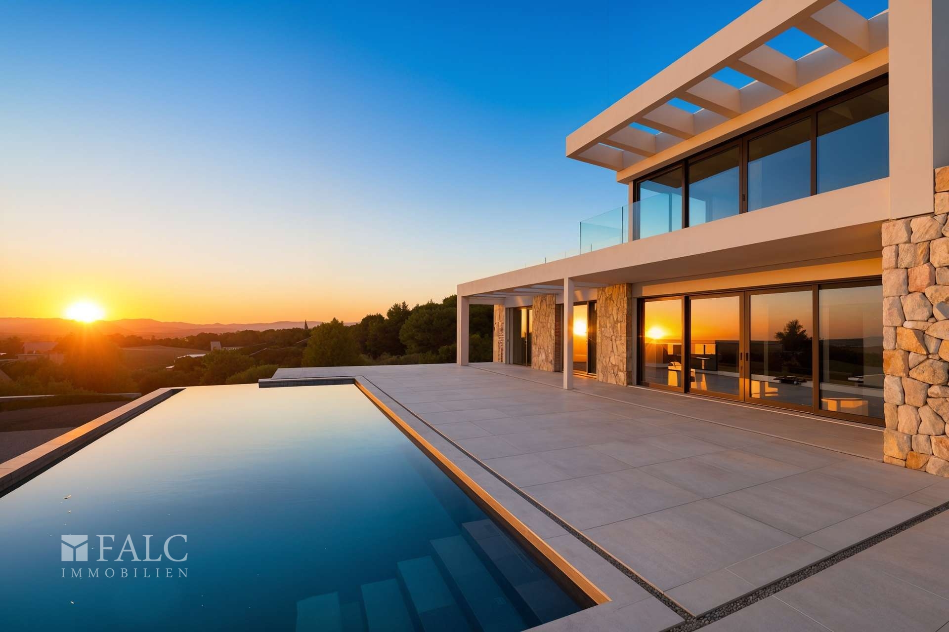 Der mediterran gestaltete Außenbereich überzeugt mit weitläufigen Terrassen, einem 44 m² großen Infinity-Pool und herrlichem Fernblick. Zwei getrennte Zisternen für Regen- und Trinkwasser unterstreichen den nachhaltigen Charakter dieser Immobilie.