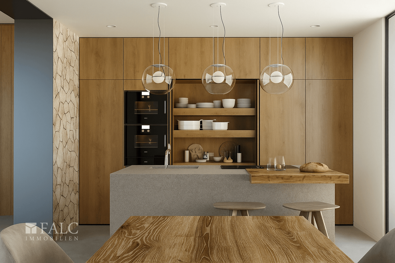 Bei der Auswahl der Materialien wurde höchster Wert auf Qualität gelegt: Feinsteinzeug, Mikrozement, Naturstein und edles Eichenholz sorgen für ein harmonisches, zeitloses Ambiente.