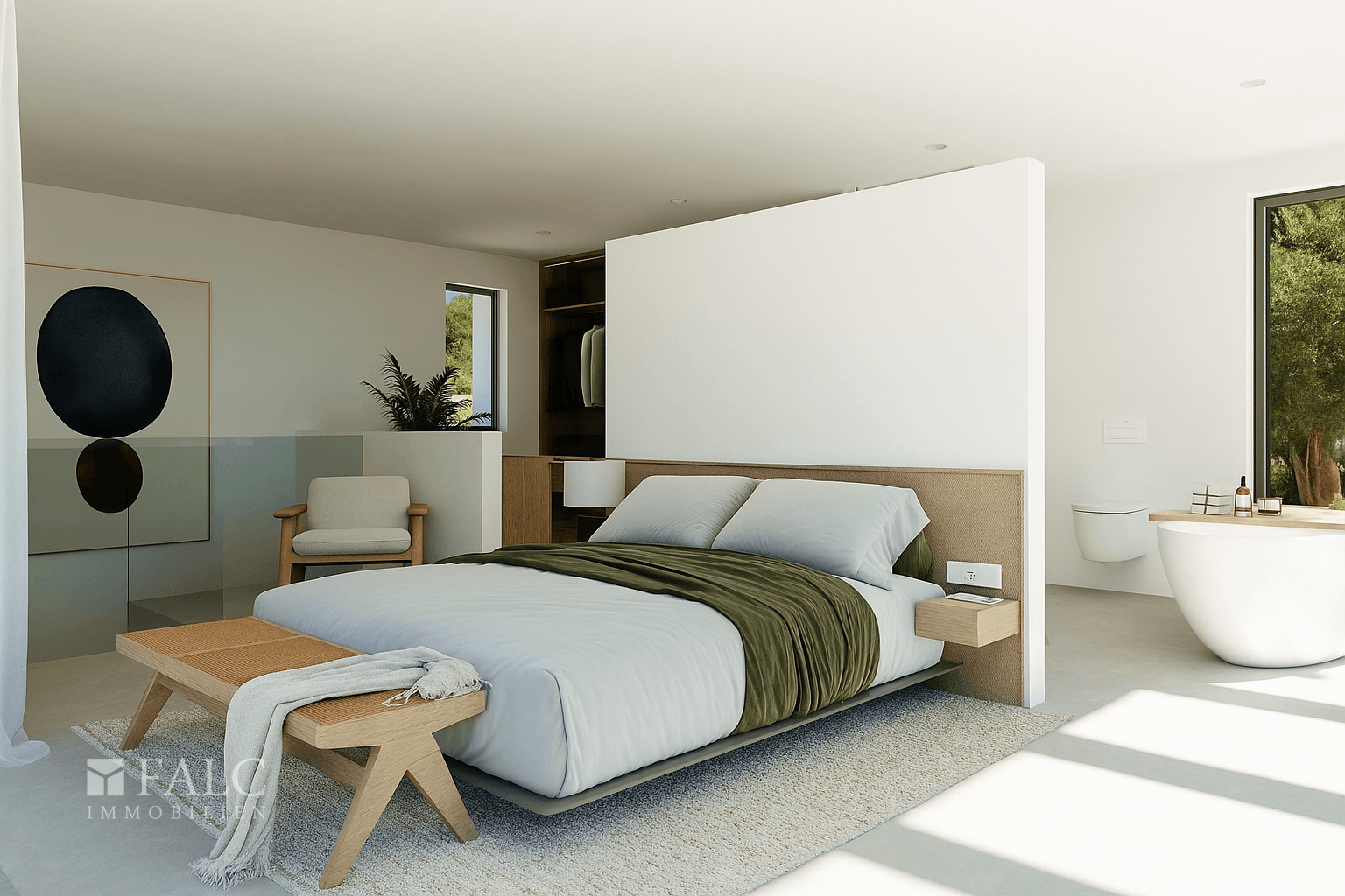 Im Obergeschoss befindet sich die luxuriöse Master-Suite mit rund 56 m² Wohnfläche – inklusive Ankleidezimmer, hochwertigem Bad mit Badewanne und Dusche sowie Zugang zu zwei privaten Terrassen mit Panoramablick über die Landschaft.