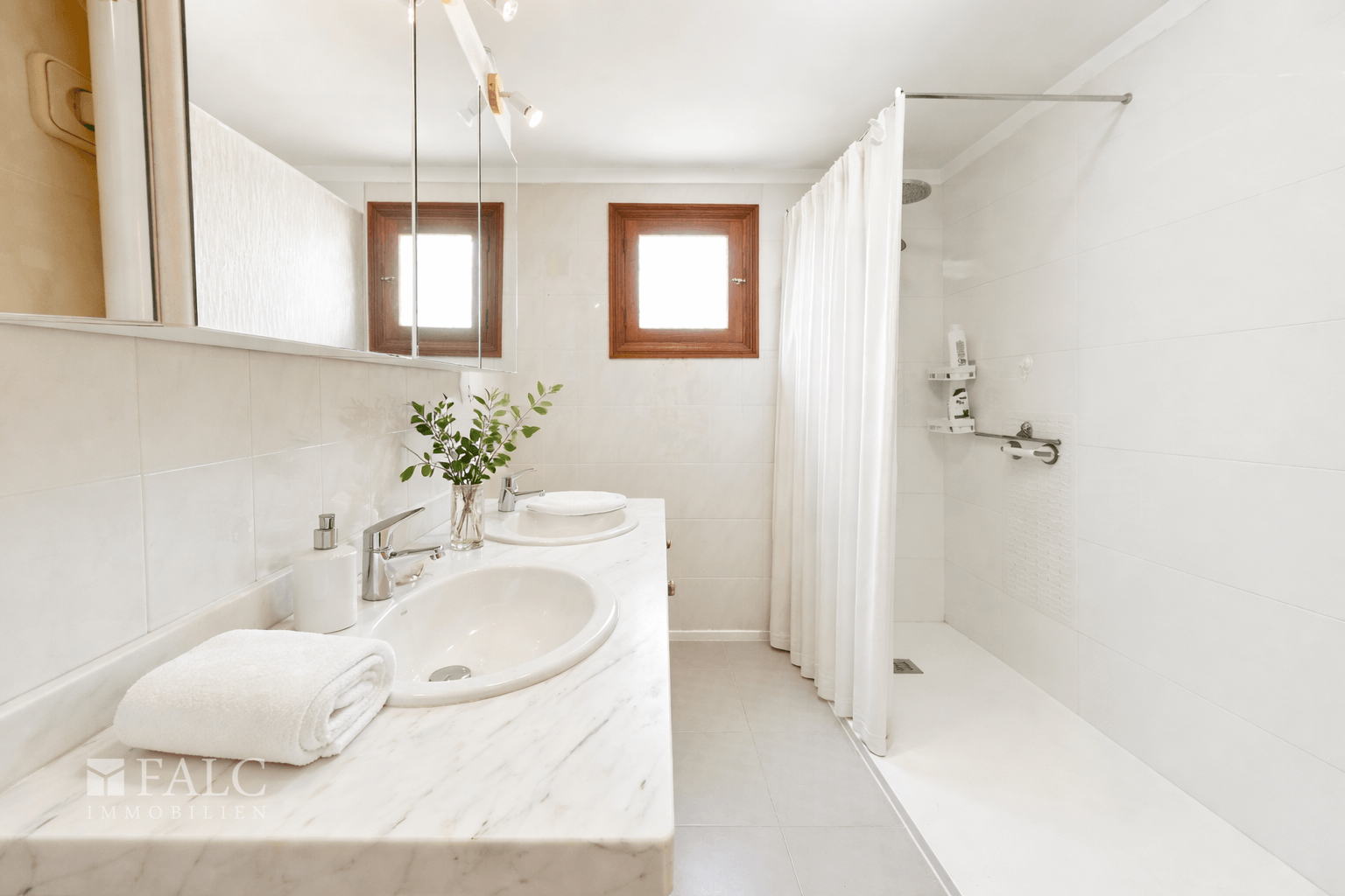 Eine interne Treppe führt von der Wohnung hinauf zur beeindruckenden Dachterrasse. Von hier aus genießen Sie einen traumhaften Panoramablick über Son Servera bis hin zum Meer. Fern-Meerblick bietet sich zudem sowohl aus der ersten Etage des Ladens als auch aus der Wohnung selbst – ein besonderes Merkmal, das diese Immobilie deutlich hervorhebt.