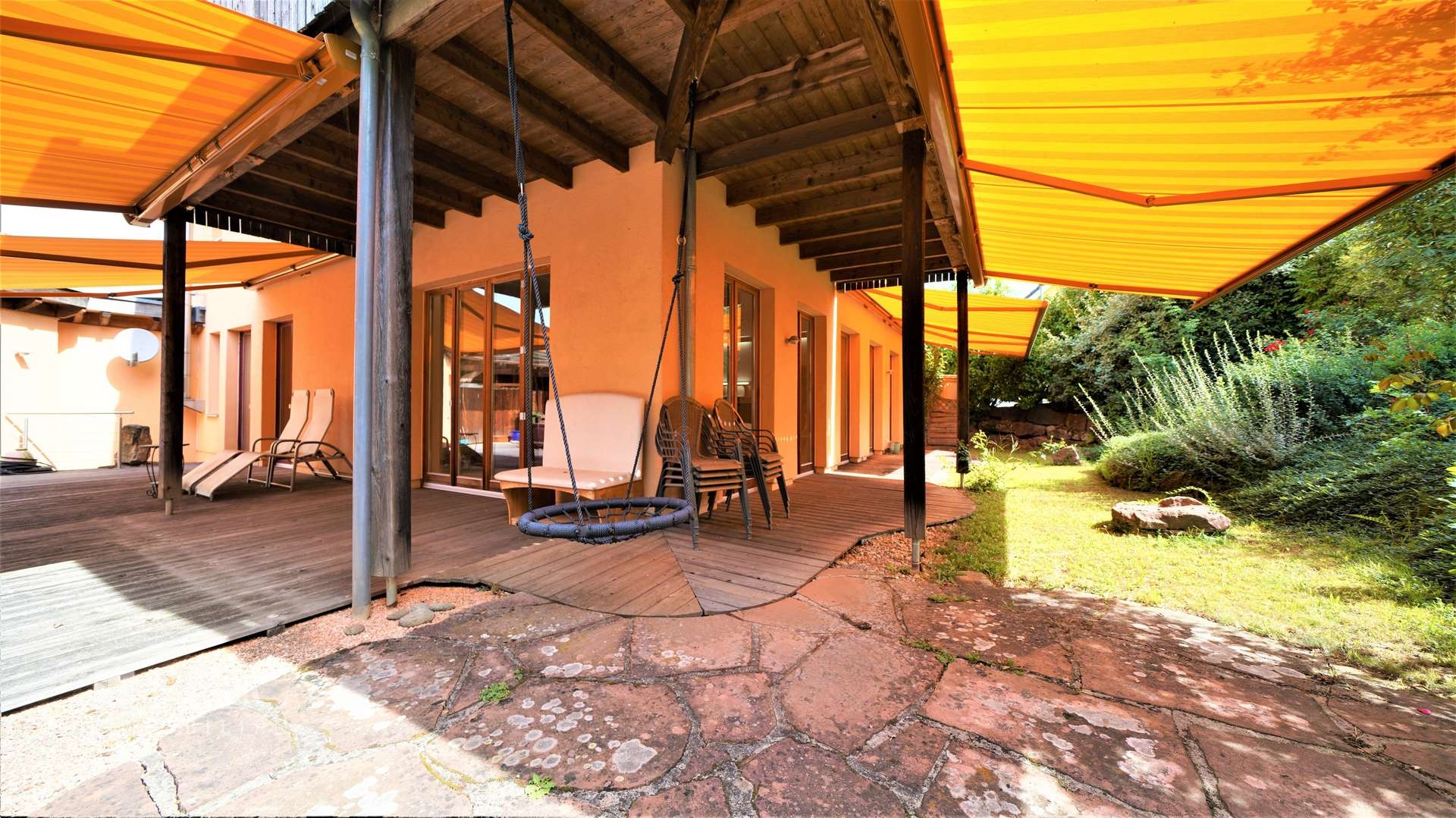 An sehr sonnigen Tagen kann die südliche Terrasse durch sechs großflächige elektrische Markisen überschattet werden, dies ermöglicht einen angenehmen Aufenthalt und senkt gleichzeitig die Temperatur in den südlich gelegenen Zimmern.