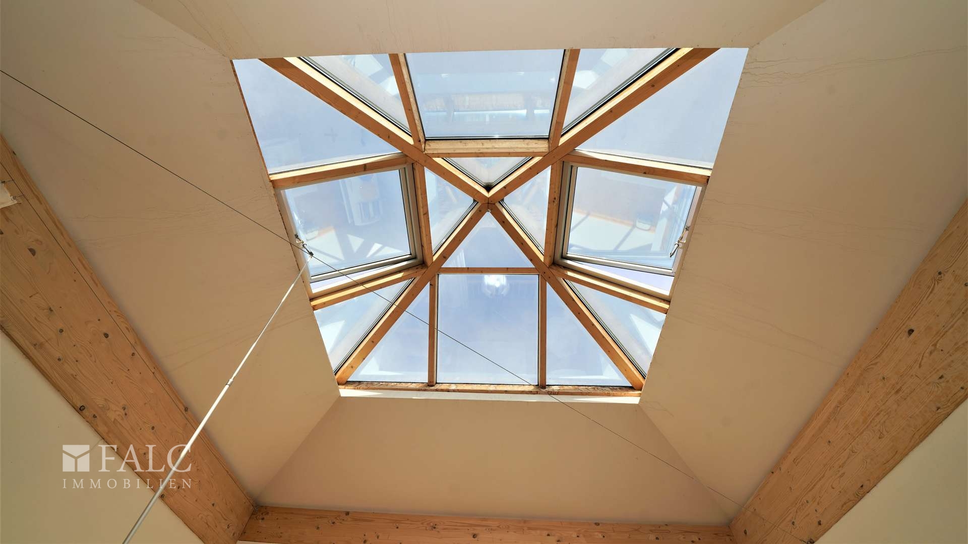 Durch die in der Dachspitze eingelassene Glaspyramide wird der großzügige Wohnraum im Obergeschoss zusätzlich mit Tageslicht geflutet. Zwei der Kuppelfenster lassen sich für die Luftzirkulation öffnen. Erleben Sie hier kuschelige Stunden mit der Familie oder lustige Spieleabende mit den Freunden.