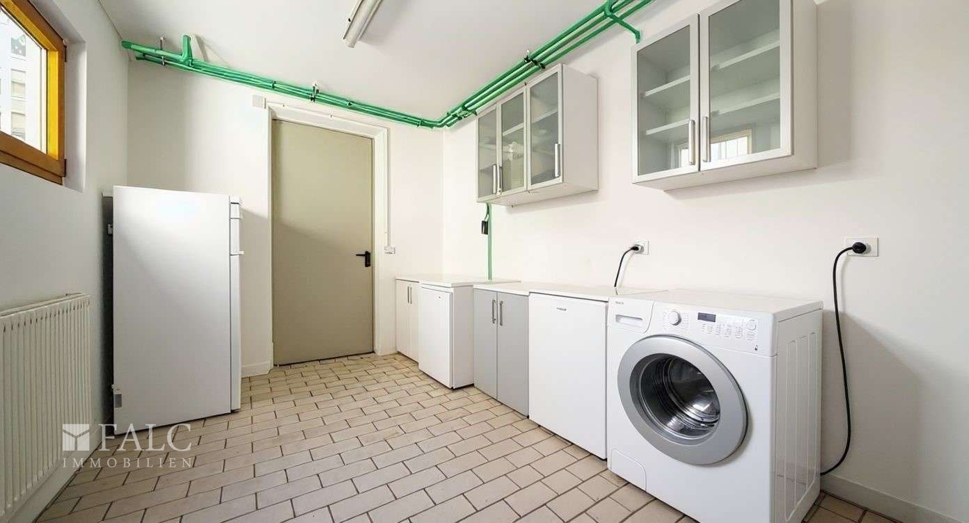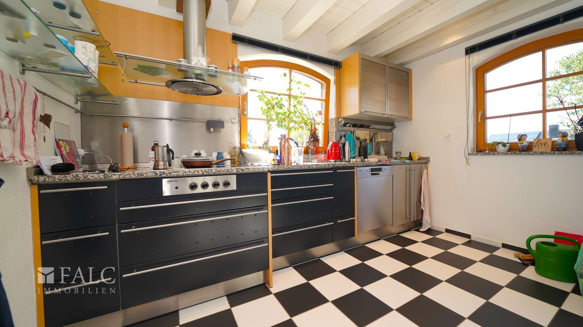 Durch die Größe und deren praktische Anordnung in L-Form verfügt die Küche über viel Stauraum für Vorräte und Utensilien, lässt daher auch größere Einkäufe zu. Die Edelstahl-Fronten in Schwarz und Silber stehen in tollem Kontrast zu den Arbeitsflächen und Boden in Schwarzweiß. Ein leistungsstarker Backofen, ein Induktionskochfeld von Miele mit großem, schwebendem Dunstabzug, eine Spülmaschine und eine geräumige Kühl- und Gefrierkombination lässt die Küchenfee frohlocken und verbleibt in der Immobilie. Verwöhnen Sie hier Ihre Lieben mit traditioneller Küche oder überraschen Sie Freunde in großer Runde mit kulinarischen Köstlichkeiten.