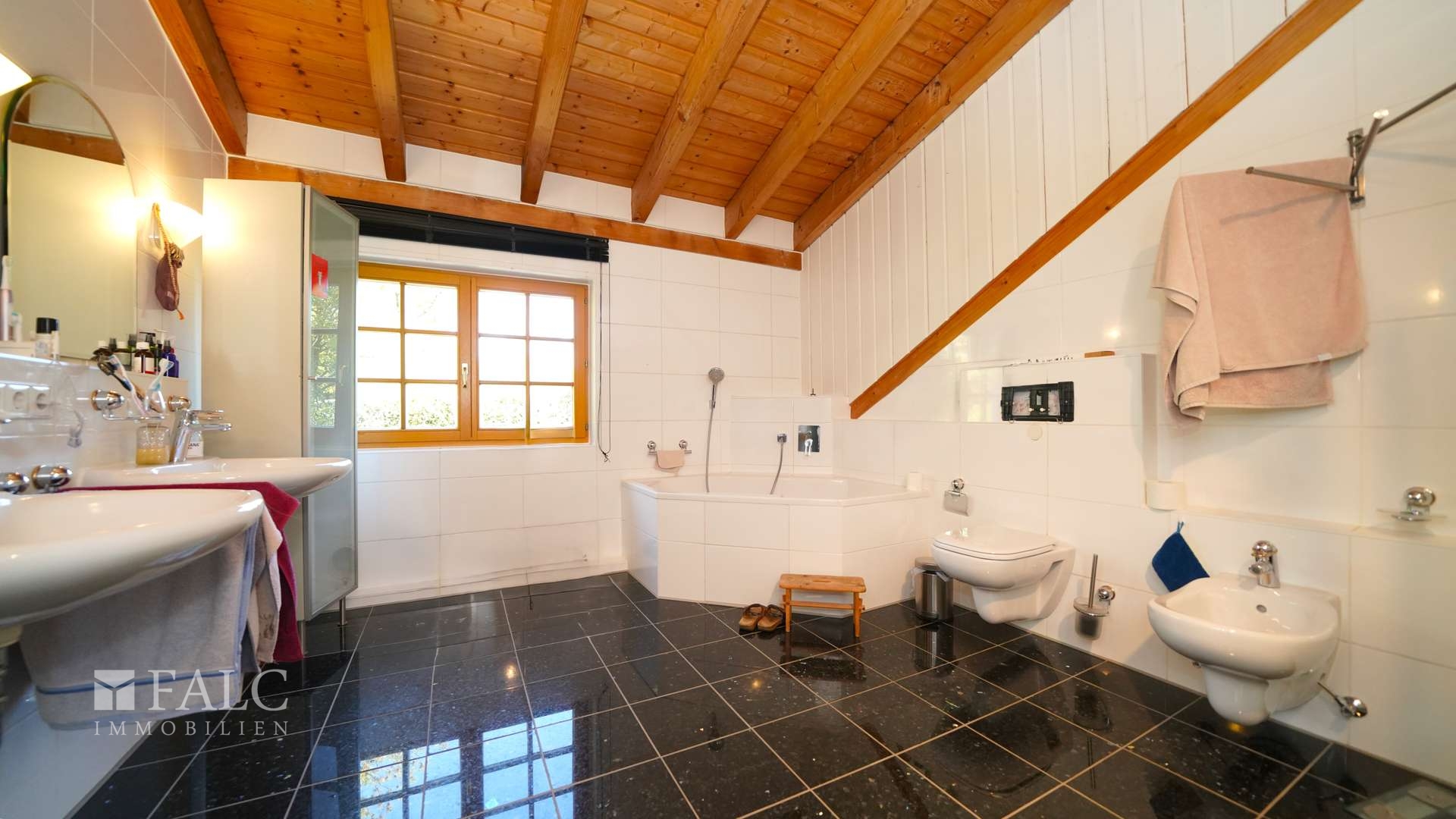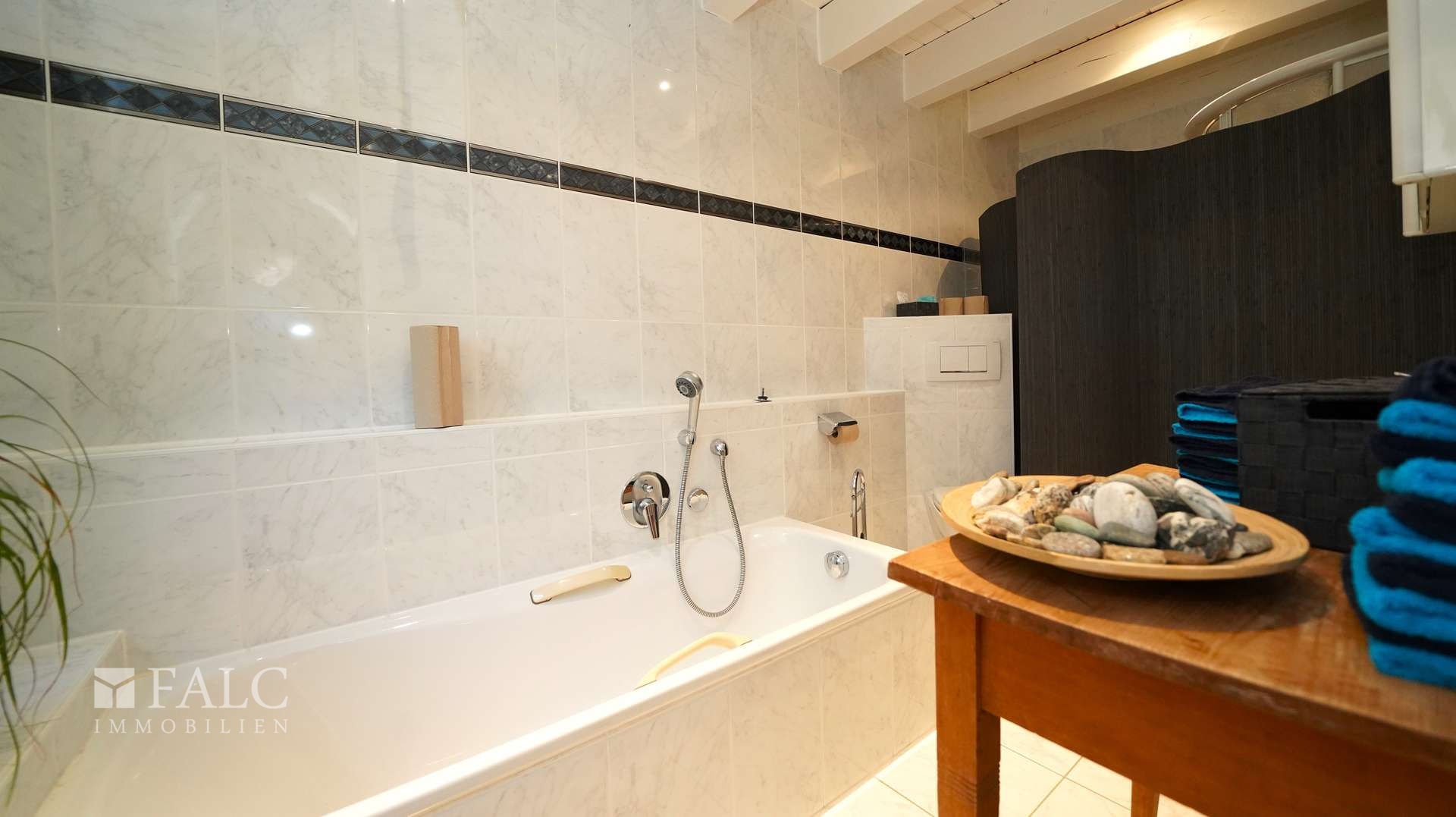 Das geräumige Bad erfüllt seine Pflichten vollkommen! Eine großzügige Eck-Badewanne lädt zu Schaumbädern, eine ebenerdige Dusche zu Erfrischungen am Morgen ein, zwei Waschbecken ersparen das Gedränge am Morgen, ebenfalls stehen eine WC-Schüssel und ein Bidet zur Verfügung. Eine Ablage darüber beherbergt schöne Flakons und Tiegel, das doppelflügige Fenster ermöglicht Stylen bei Tageslicht.