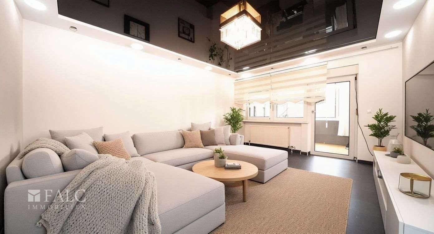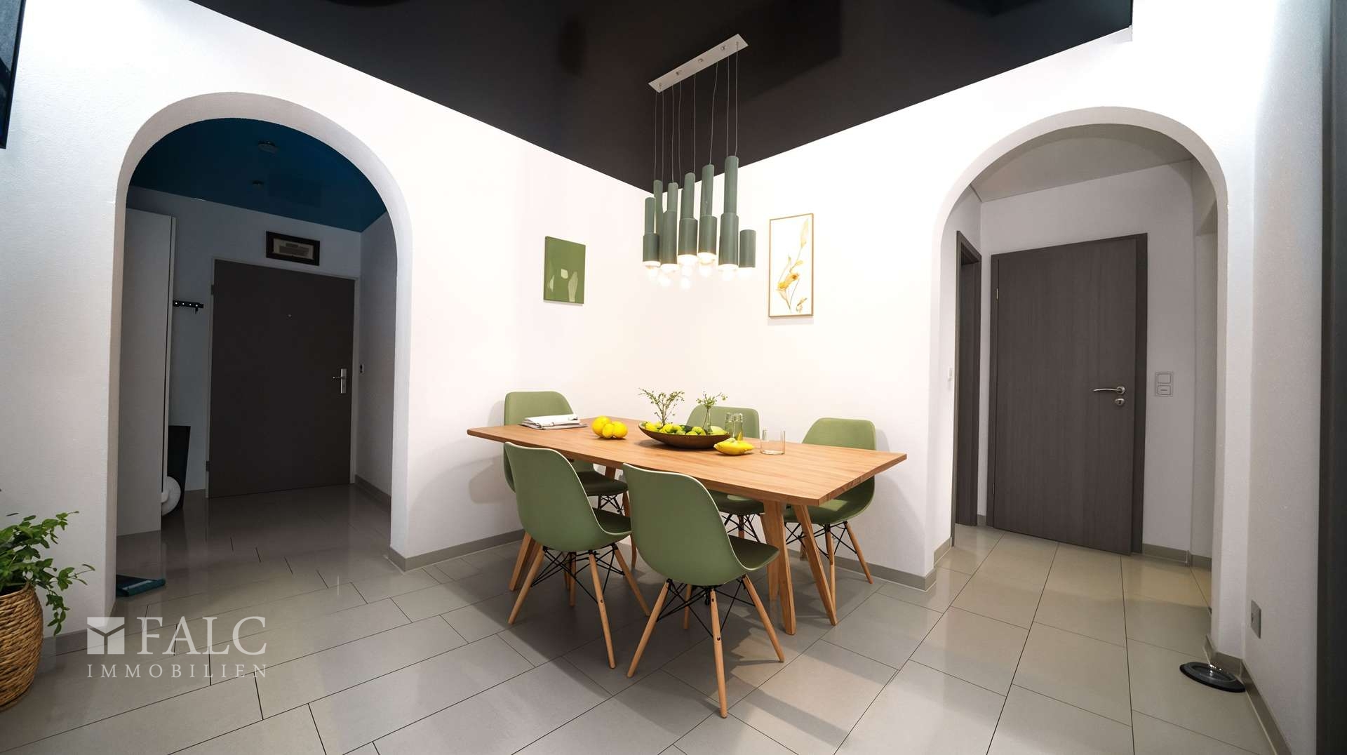 Das Herzstück der Wohnung bildet das lichtdurchflutete ca. 22 m² große Wohnzimmer, das dank weiter Fensterfront mit natürlichem Tageslicht durchflutet wird und eine besonders angenehme Wohnatmosphäre schafft. Der edle schwarze Fliesenboden verleiht dem Raum eine moderne, zugleich elegante Note – ein Gestaltungselement, das sich harmonisch in die angrenzende Küche fortsetzt.