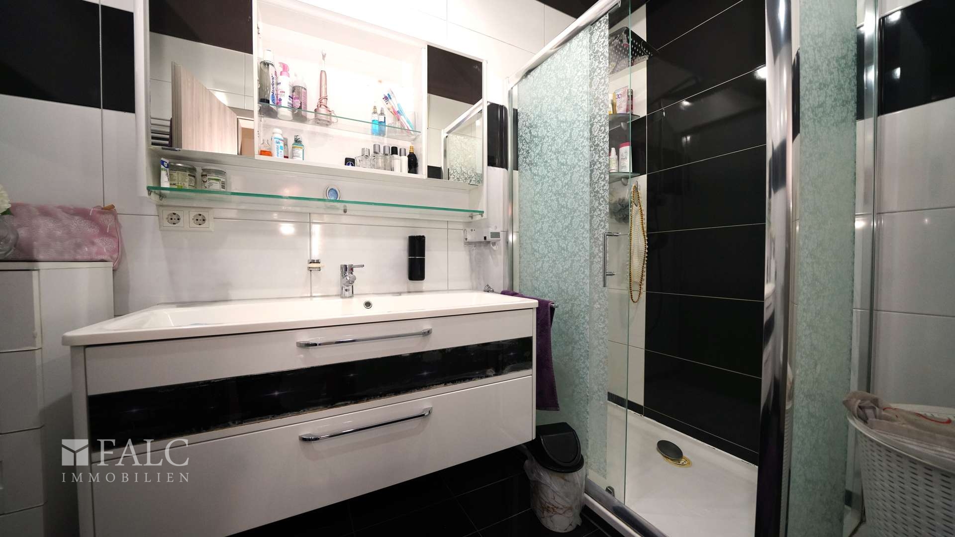 Das moderne Badezimmer überzeugt mit einer großzügigen Dusche, die mit einer komfortablen Regendusche ausgestattet ist – ideal für einen entspannten Start in den Tag. Ein stilvolles Waschbecken rundet die durchdachte Ausstattung ab. Besonders praktisch: Das WC ist separat vom Badezimmer untergebracht, was den Alltag – insbesondere in Familienhaushalten – deutlich erleichtert.