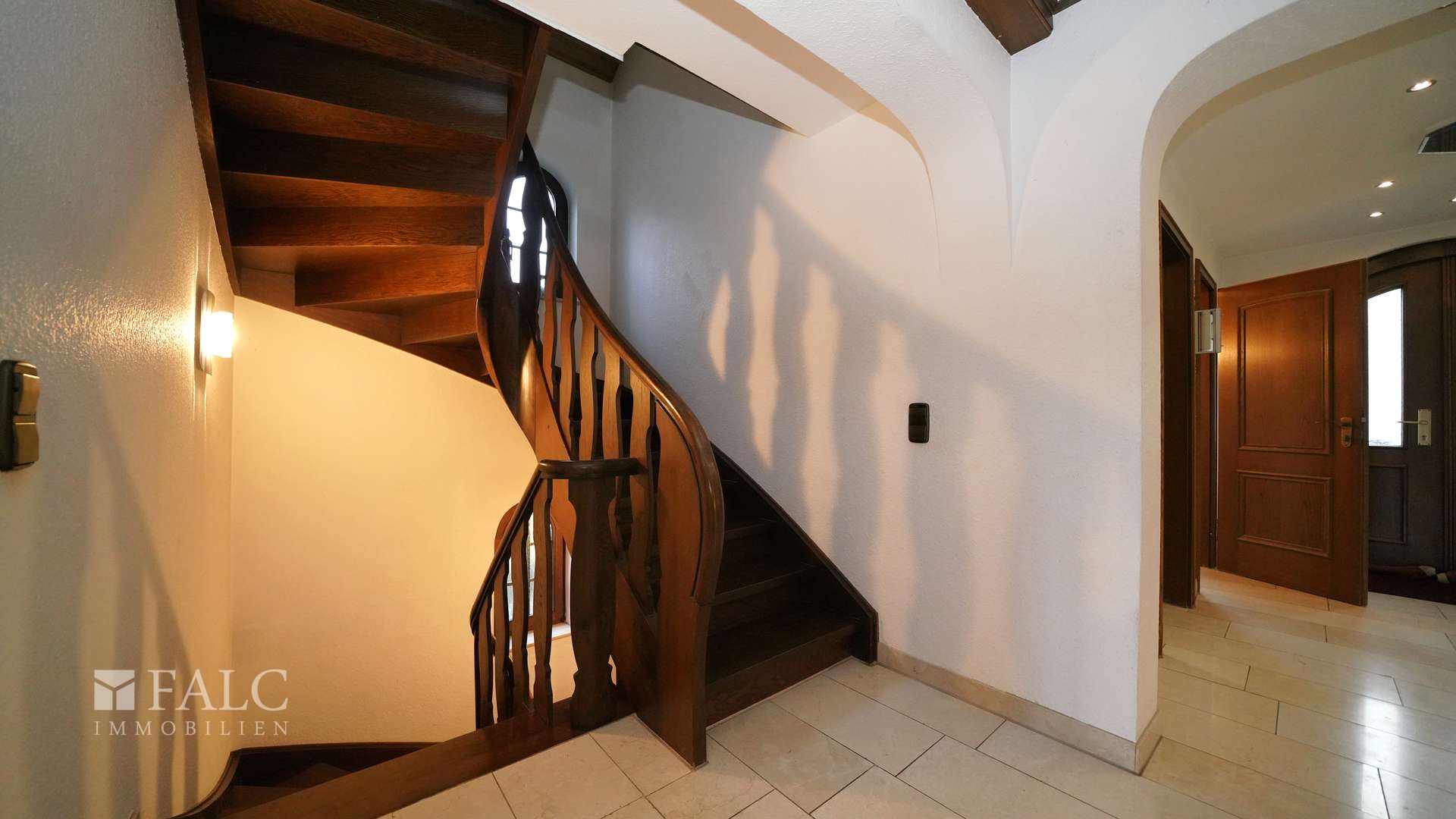 Schon beim Betreten des Hauses spürt man den besonderen Charme dieser Villa: Durch die Hangposition erreicht man das Erdgeschoss über eine breite Außentreppe, die elegant zum Eingang führt. Sobald Sie die Tür öffnen, gelangen Sie in eine offene Diele, die den Blick direkt in mehrere Bereiche des Hauses lenkt.