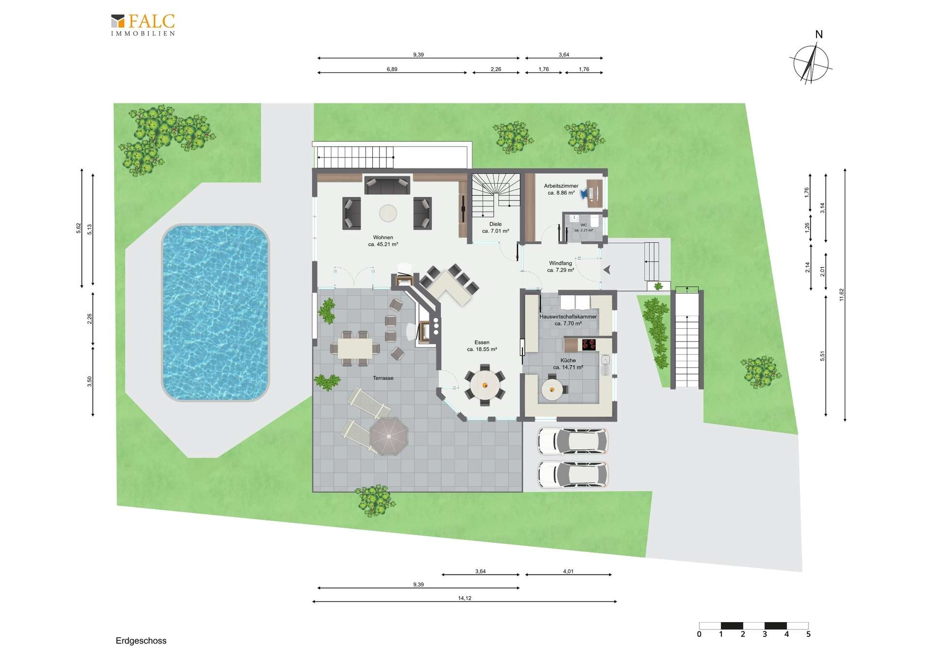 Abgerundet wird das Gesamtpaket durch eine geräumige Doppelgarage mit elektrischem Tor, die Ihnen komfortablen Zugang und ausreichend Platz für Ihre Fahrzeuge bietet.