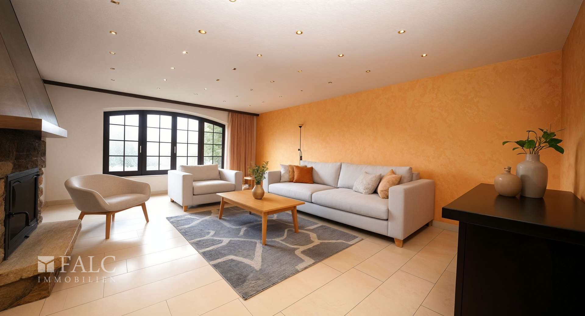 Rechts der Küche entfaltet sich der beeindruckende Wohn- und Essbereich. Mit circa 63 m² bildet dieser offene Raum das Herzstück des Hauses. Großzügig, hell und vielseitig gestaltbar - hier finden Familienleben, gemütliche Abende und gesellige Momente gleichermaßen ihren Platz. Moderne Deckenspots setzen stilvolle Lichtakzente, während der elegante Marmorboden und der Kamin eine warme und luxuriöse Atmosphäre schaffen.