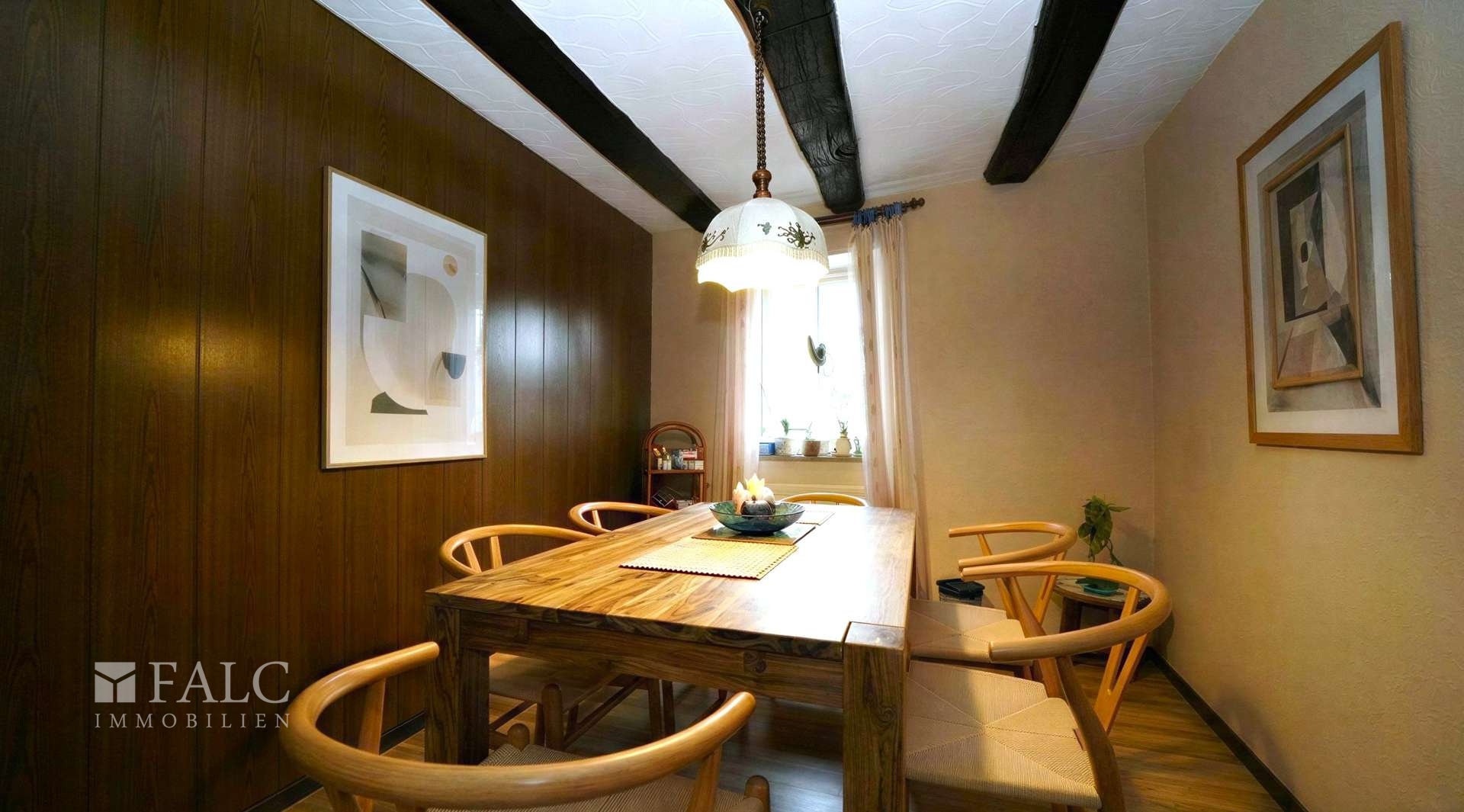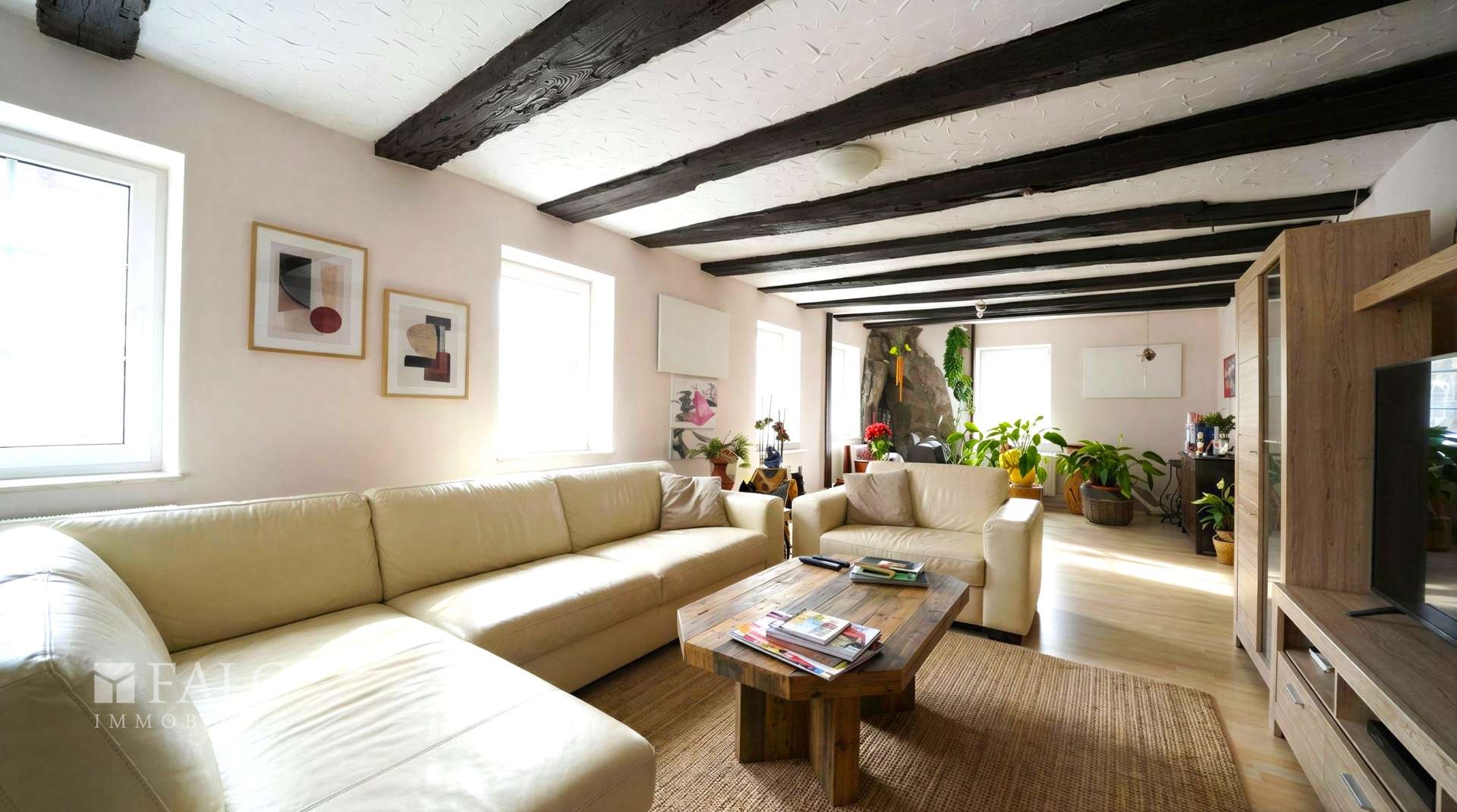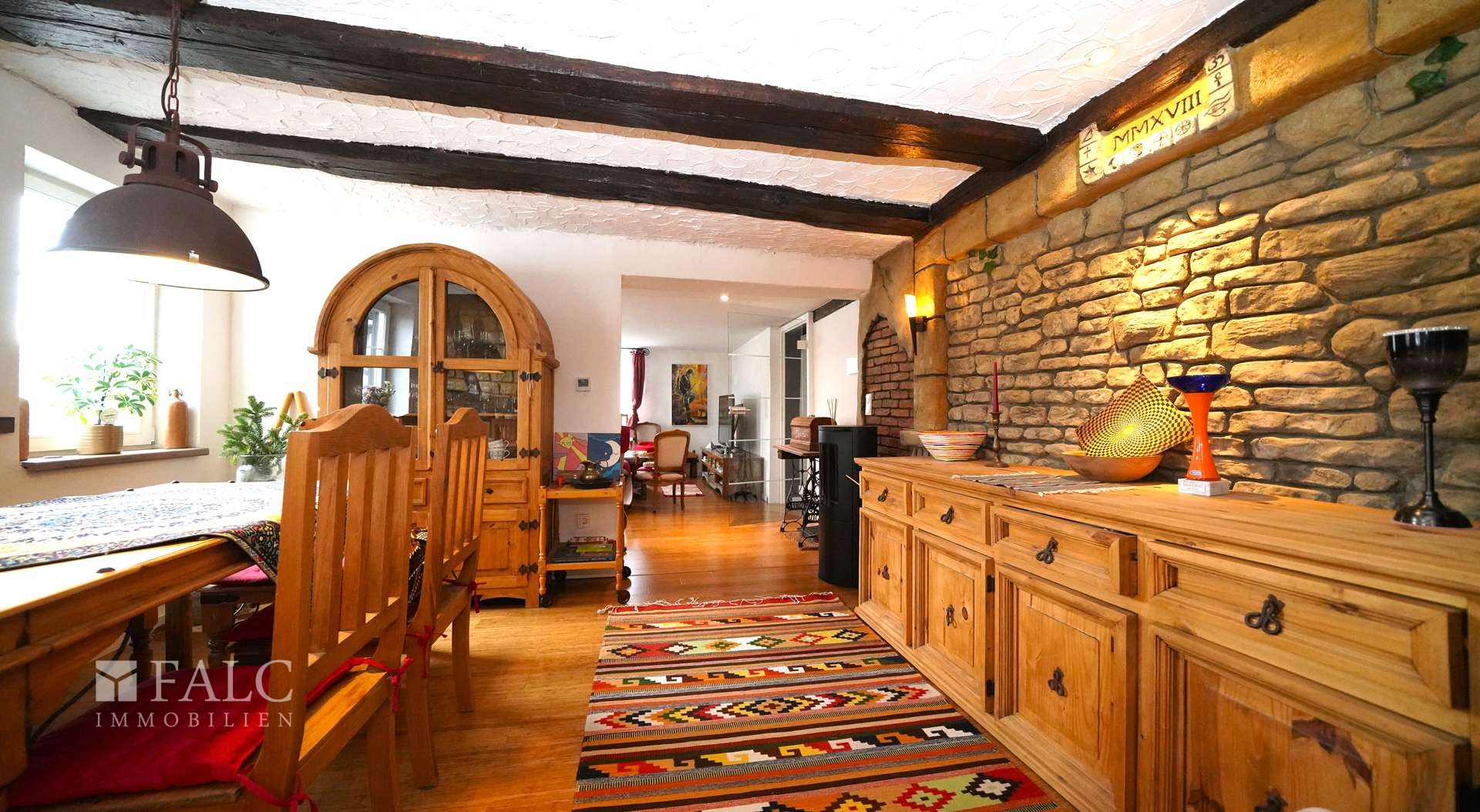 Der offen gestaltete Ess- und Wohnbereich überzeugt mit einer Gesamtfläche von über 30 m². Stilvolle Steinwände und die originalen Holzbalken verleihen diesem Raum einen unverwechselbaren Charme und unterstreichen den Charakter der Immobilie. Hier verbindet sich der Flair vergangener Zeiten harmonisch mit modernem Wohnkomfort.