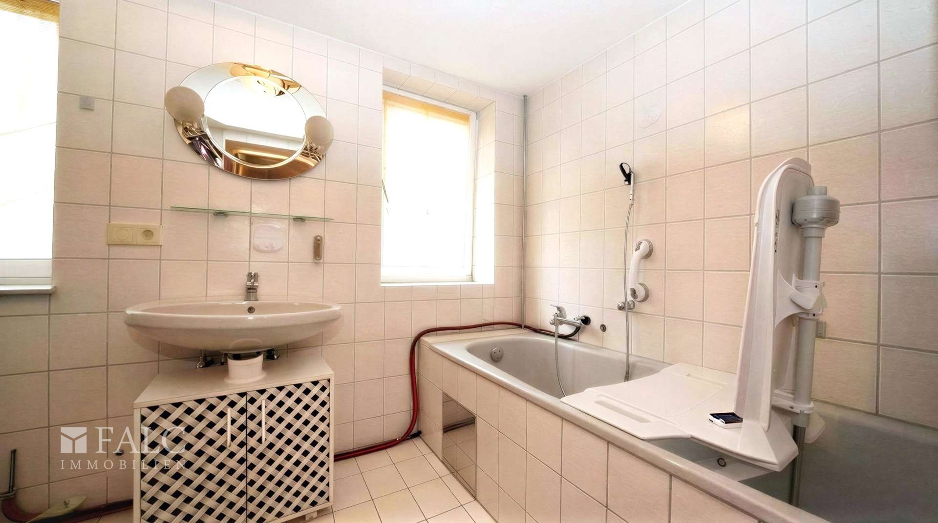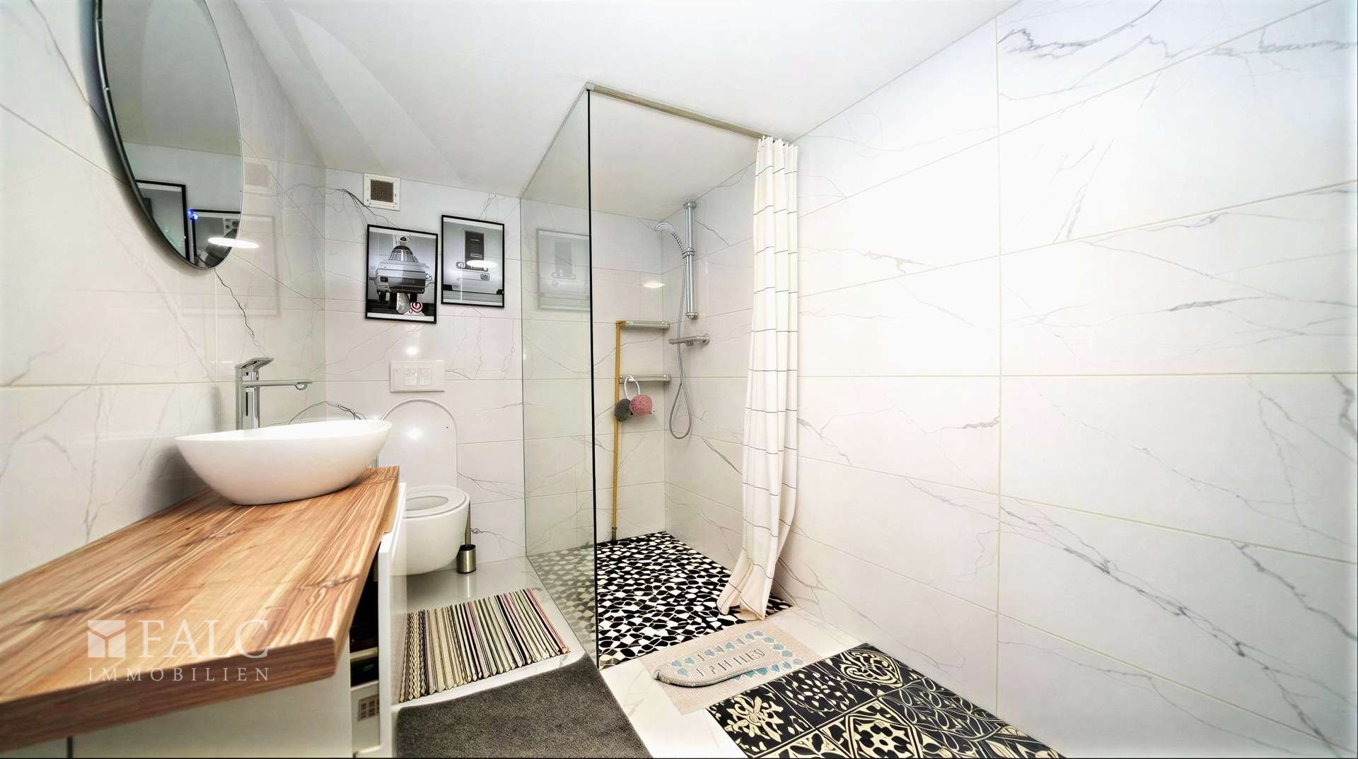 Das Badezimmer befindet sich in unmittelbarer Nähe zum Schlafzimmer und präsentiert sich in pflegeleichter Ausstattung mit zeitloser, heller Gestaltung. Ein separates Gäste-WC im Vorbereich ergänzt das Raumangebot und sorgt für zusätzlichen Komfort für Ihre Gäste.