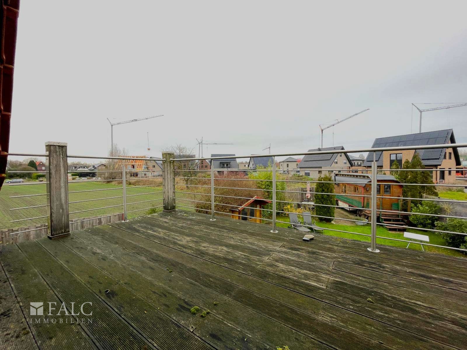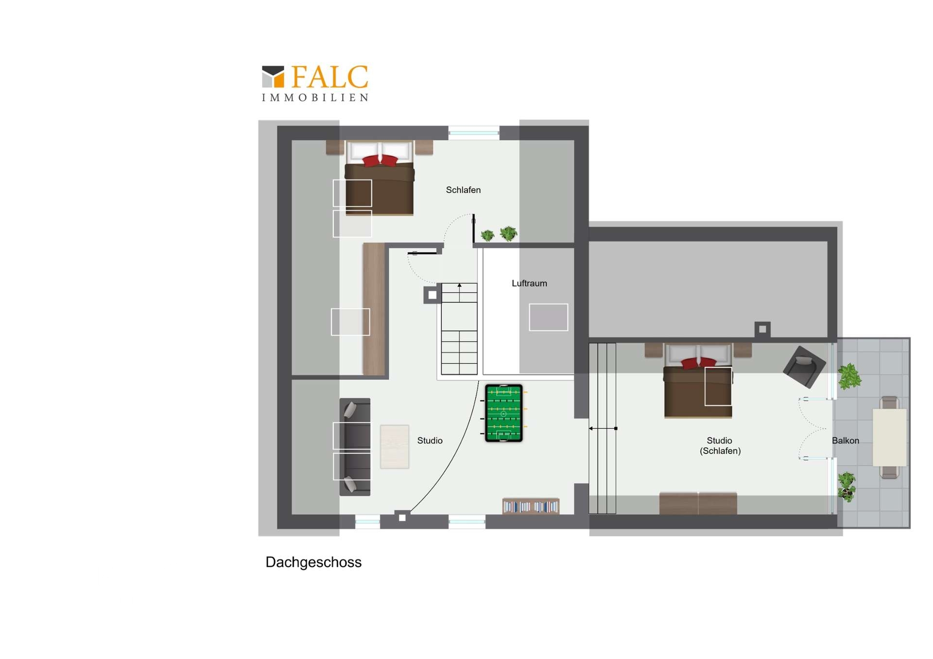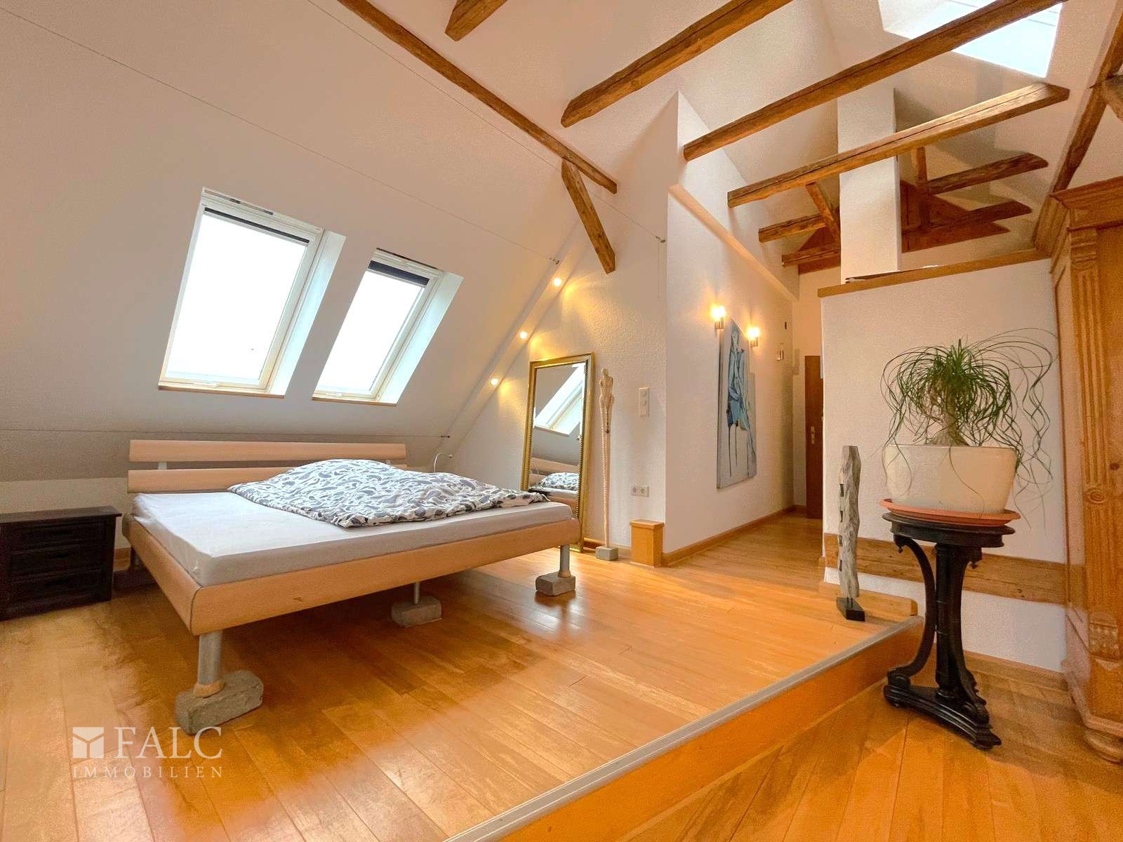 Über die Treppe erreichen Sie das Obergeschoss, in dem ein sehr großer Raum in Studioform mit Zugang zu einem Balkon beeindruckt. Dieser offene Bereich eignet sich ideal als großzügiges Wohnzimmer, Atelier oder Homeoffice. Ein weiteres Schlafzimmer ergänzt das Raumangebot dieser Etage. Zudem befindet sich auf halber Treppenhöhe ein zweites Badezimmer, das aus einem ehemaligem Kinderzimmer geschaffen wurde und modern nutzbar ist. Küchenanschlüsse im Obergeschoss ermöglichen eine potenzielle zweite Wohneinheit.