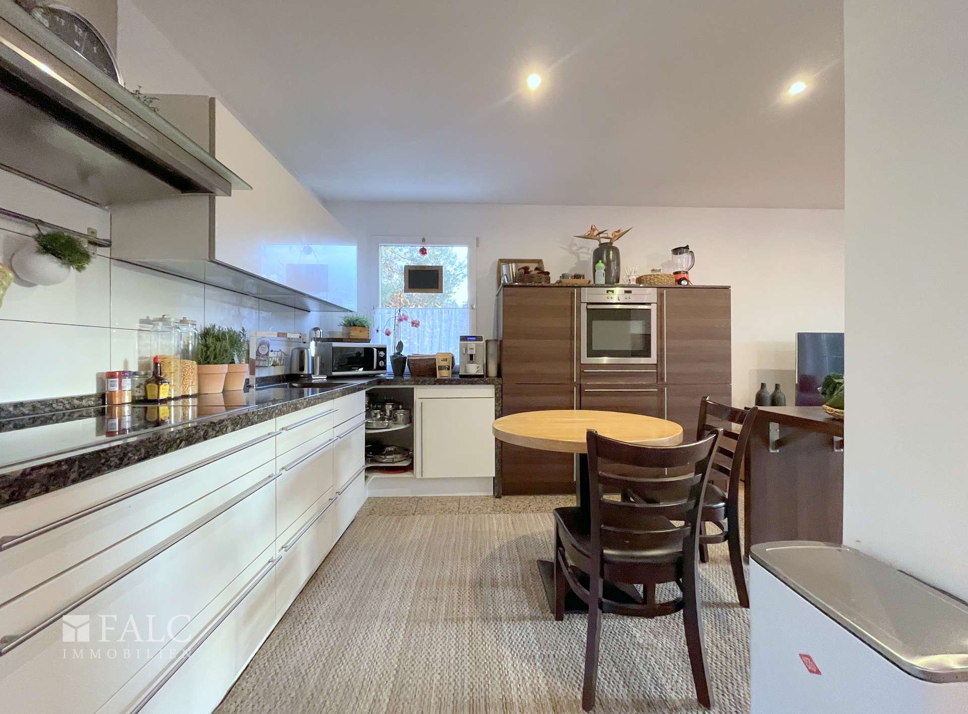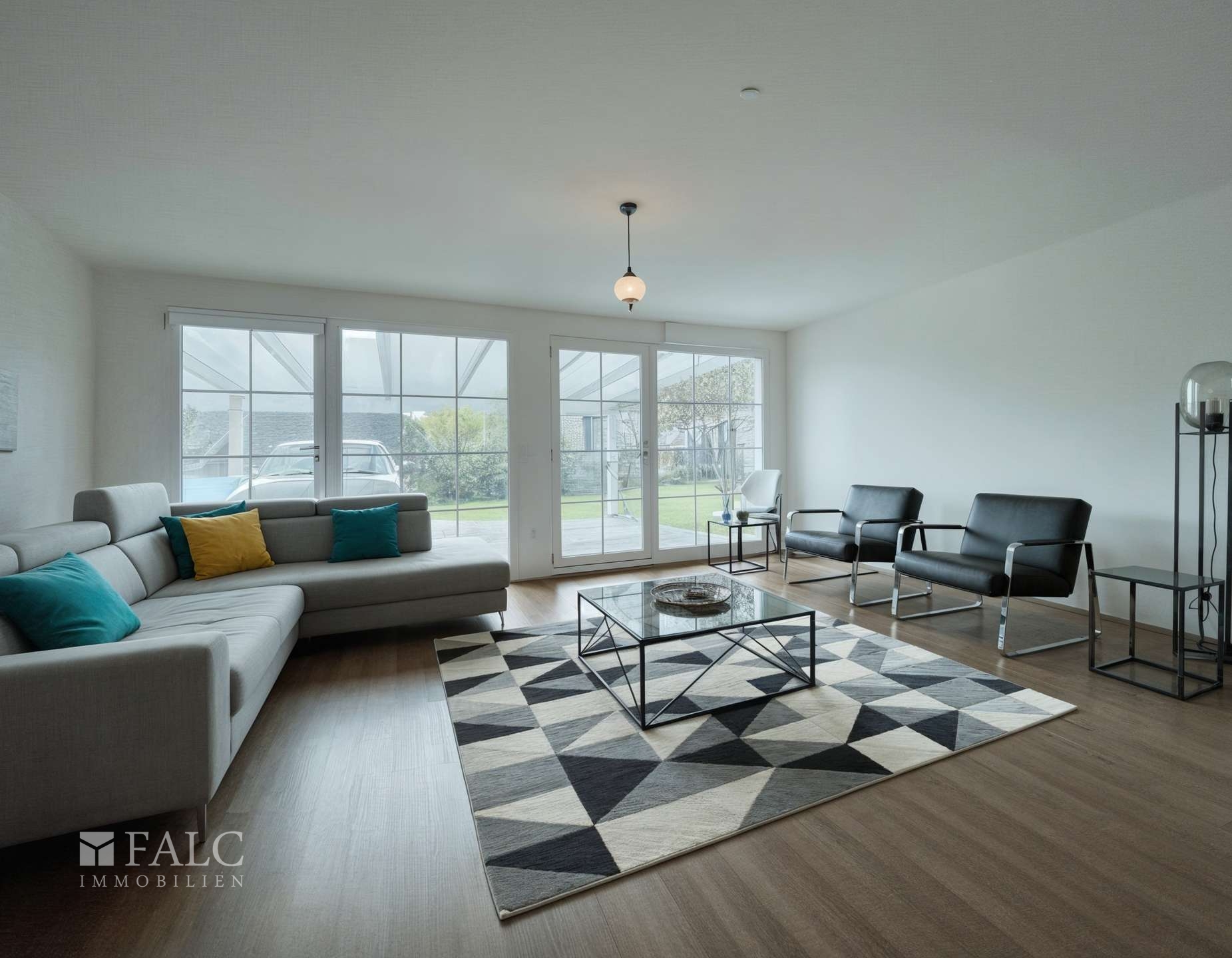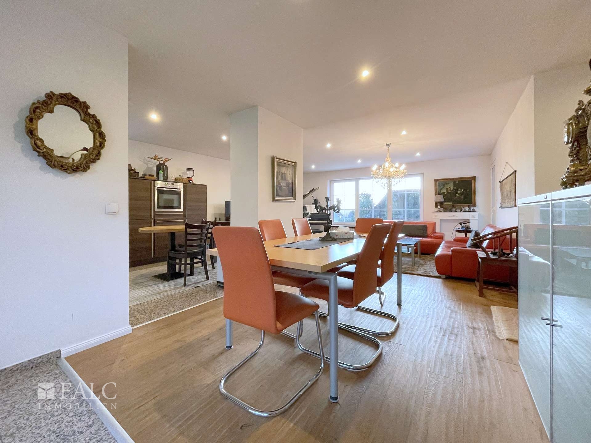 Im oberen Geschoss öffnet sich der helle und großzügige Wohn- und Essbereich mit offener Küche. Von hier aus besteht Zugang sowohl auf den Balkon als auch auf die angrenzende Terrasse, die einen schönen Blick auf das Grundstück bietet. Ein angrenzender Flur führt weiter in einen Ankleideraum, das Elternschlafzimmer sowie in das Tageslichtbad.