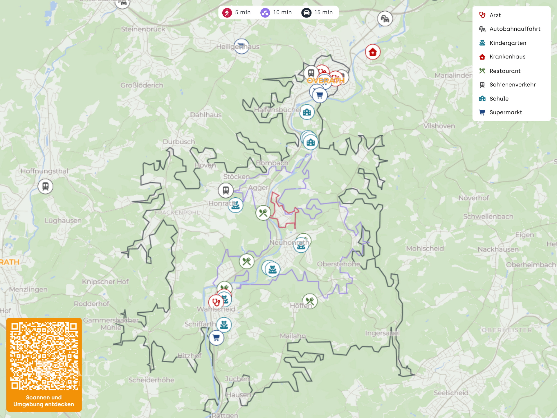 Die Umgebung bietet zudem zahlreiche Grünflächen und Parks, die zu erholsamen Spaziergängen einladen. Für kulturelle Ausflüge sind Sehenswürdigkeiten wie der Wahlscheider Nachen und die Burg Honrath leicht erreichbar. Insgesamt bietet diese Lage eine perfekte Balance zwischen ländlicher Ruhe und städtischer Anbindung, ideal für Familien und Berufspendler gleichermaßen.