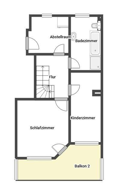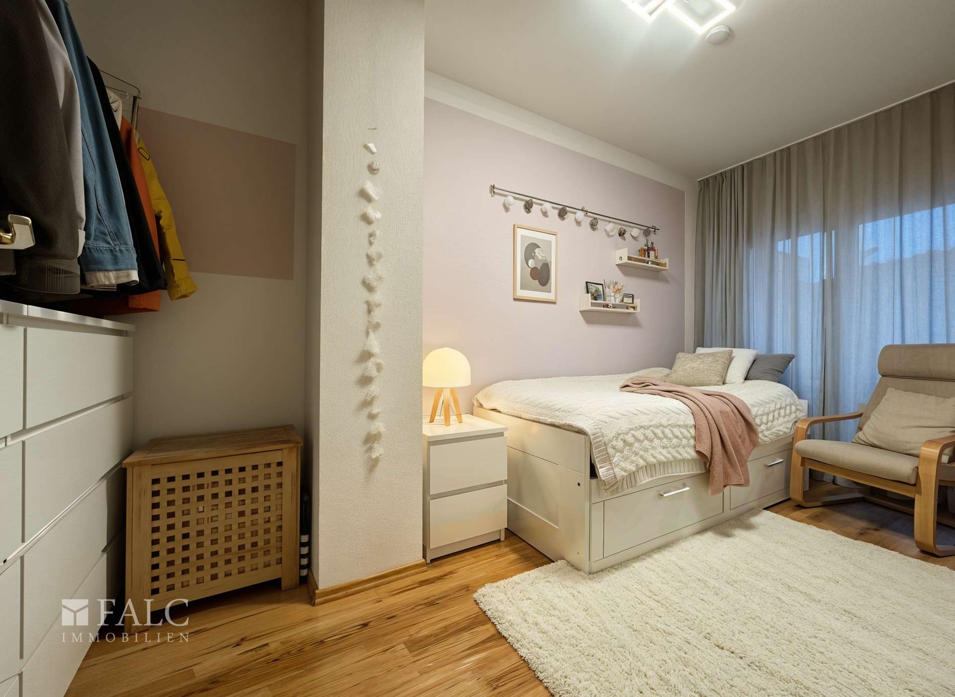 Eine Etage tiefer befinden sich zwei ruhig gelegene Schlafzimmer – eines davon ebenfalls mit Balkon, ideal als Elternschlafzimmer, das andere perfekt nutzbar als Kinderzimmer, Gästezimmer oder Homeoffice. Das Badezimmer komplettiert diese Ebene und sorgt für zusätzlichen Komfort.