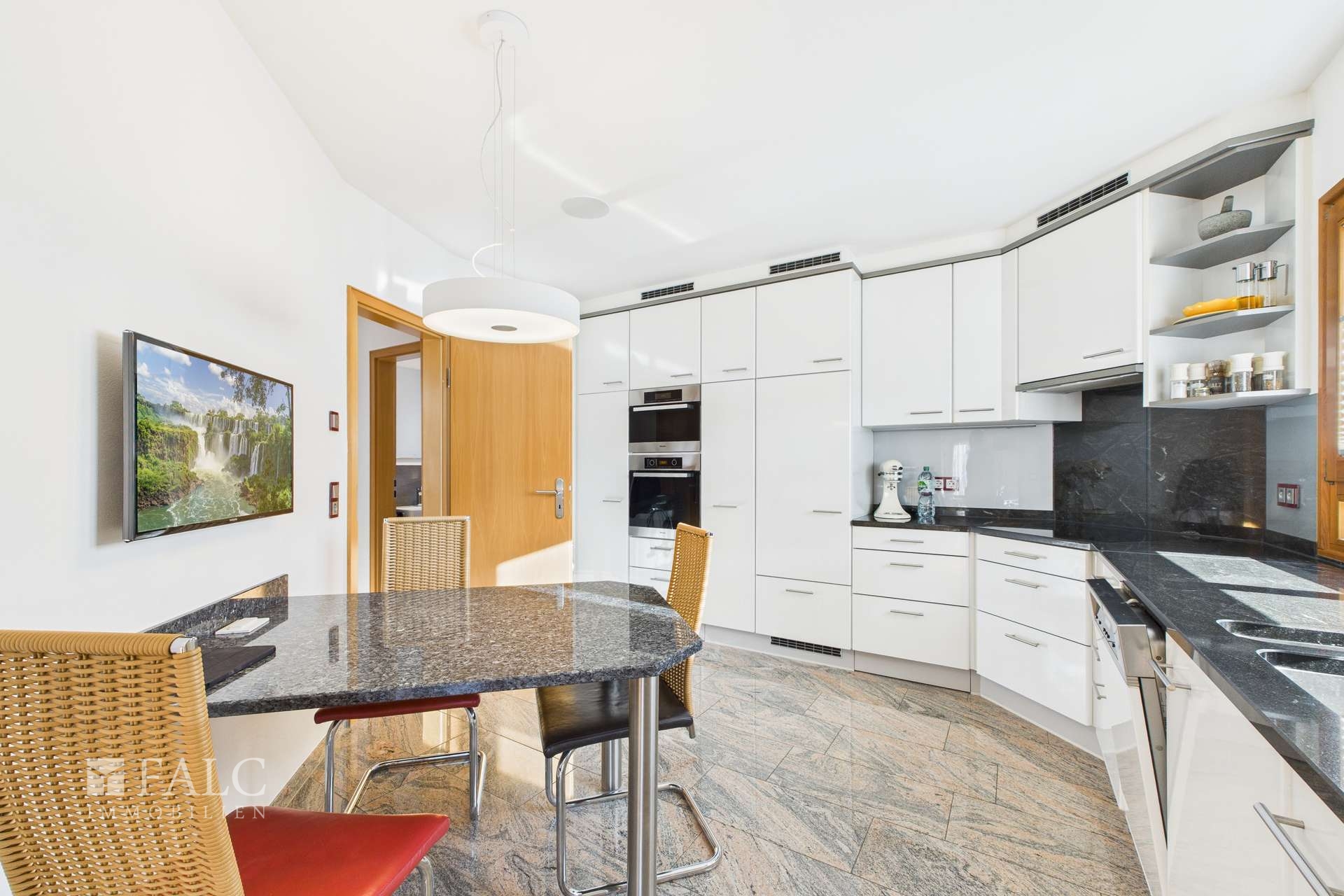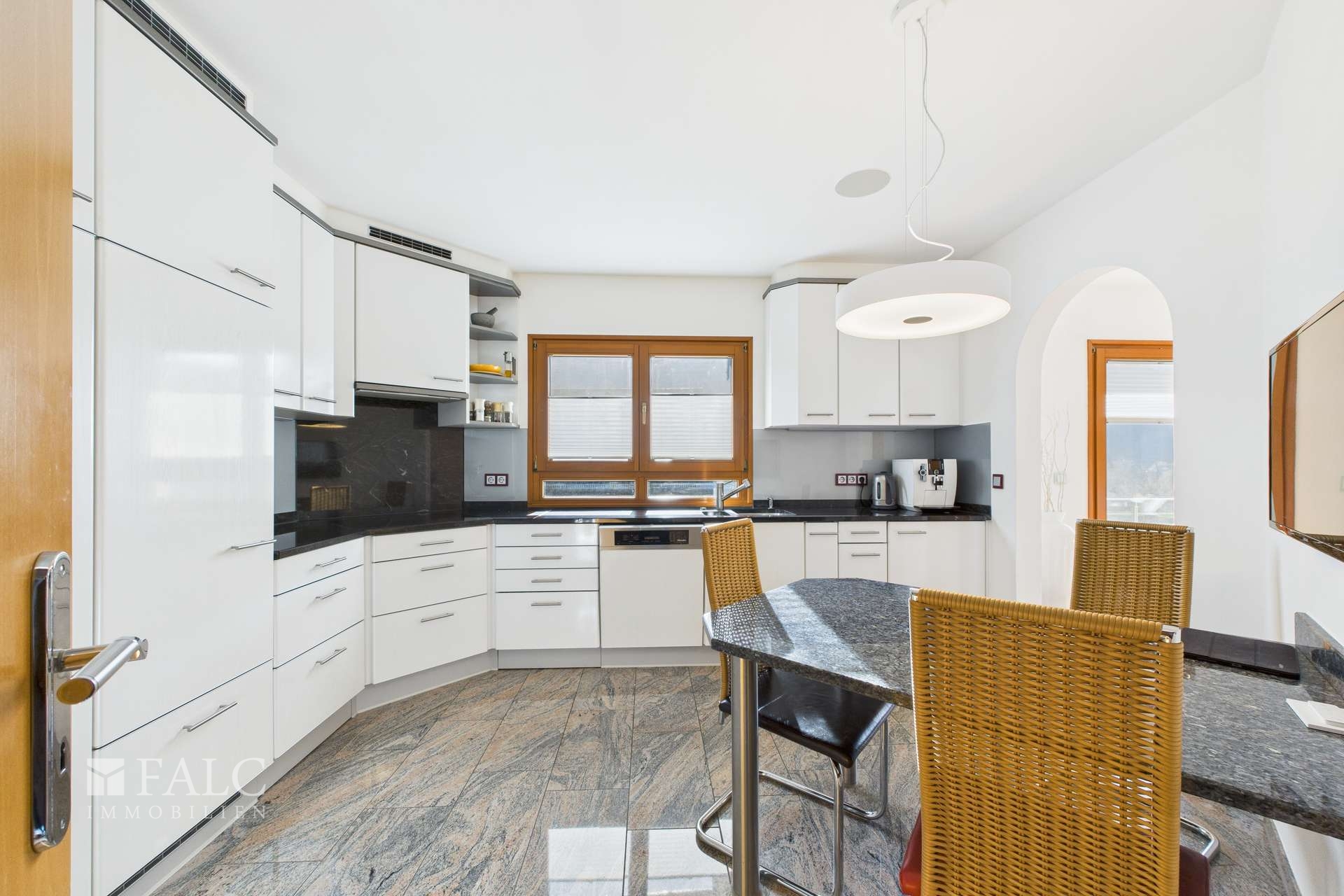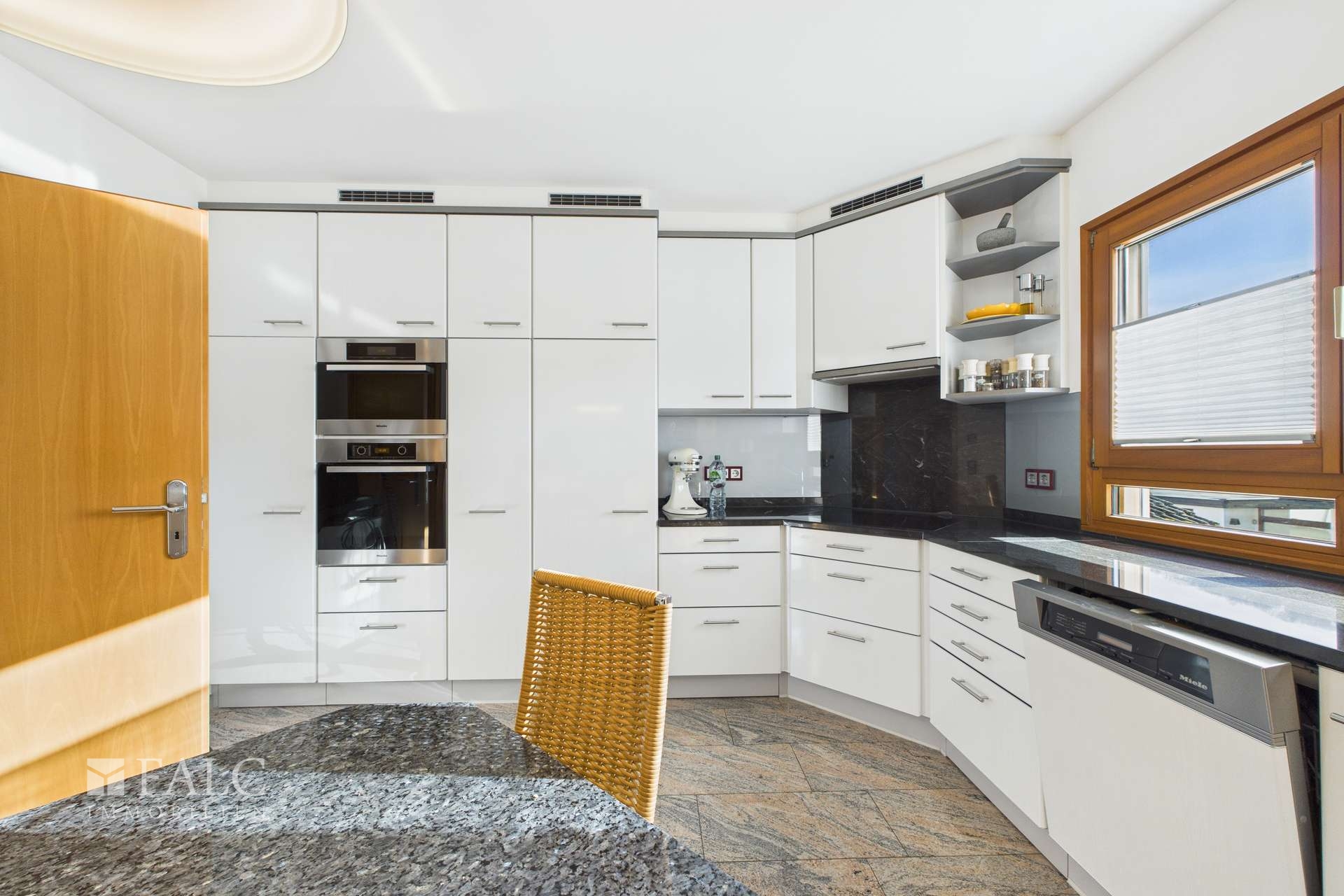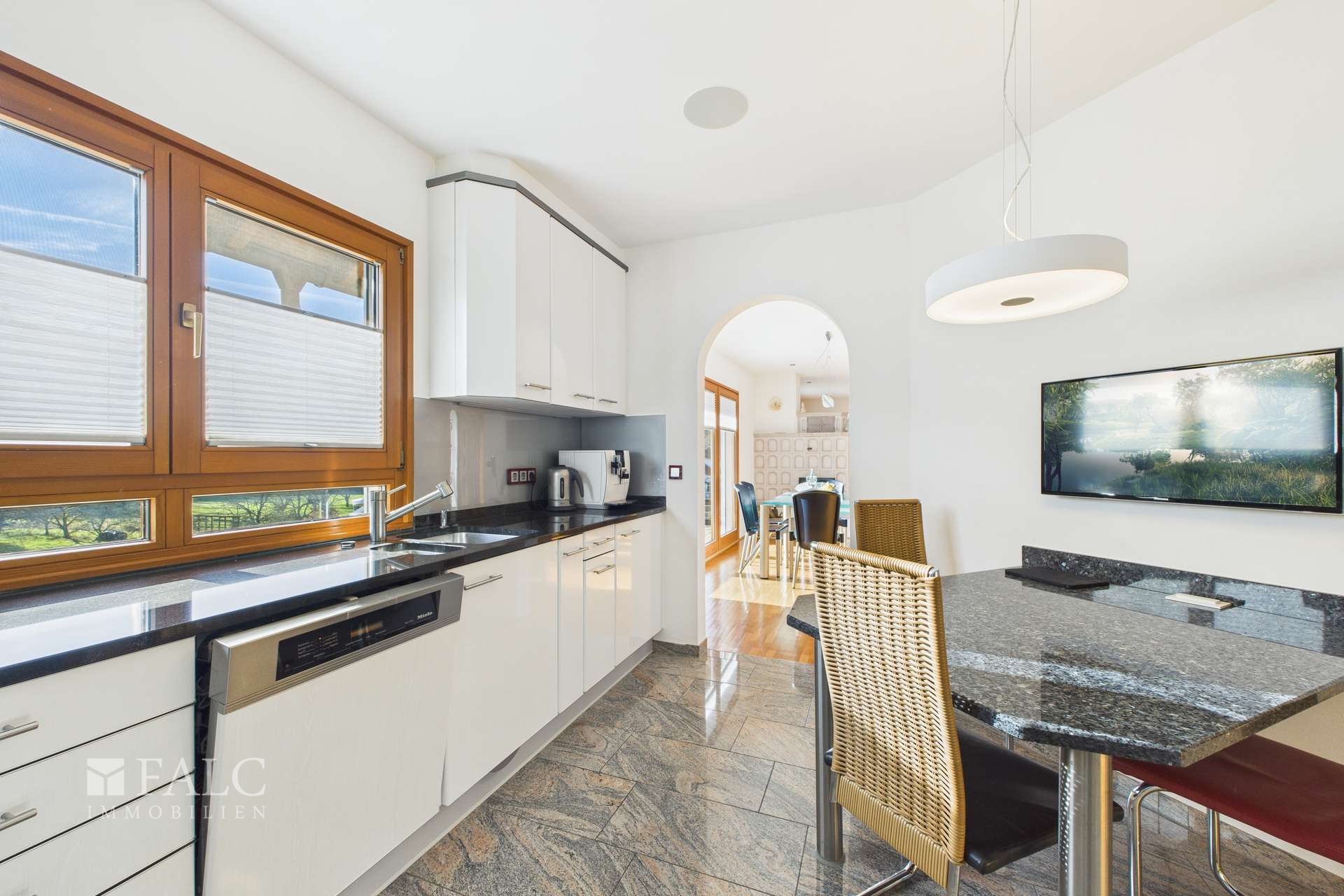 Die Küche präsentiert sich als echtes Highlight: Edle Granitarbeitsplatten treffen auf exklusive Miele-Einbaugeräte und schaffen ein elegantes wie funktionales Ambiente für anspruchsvolles Kochen und Genießen.