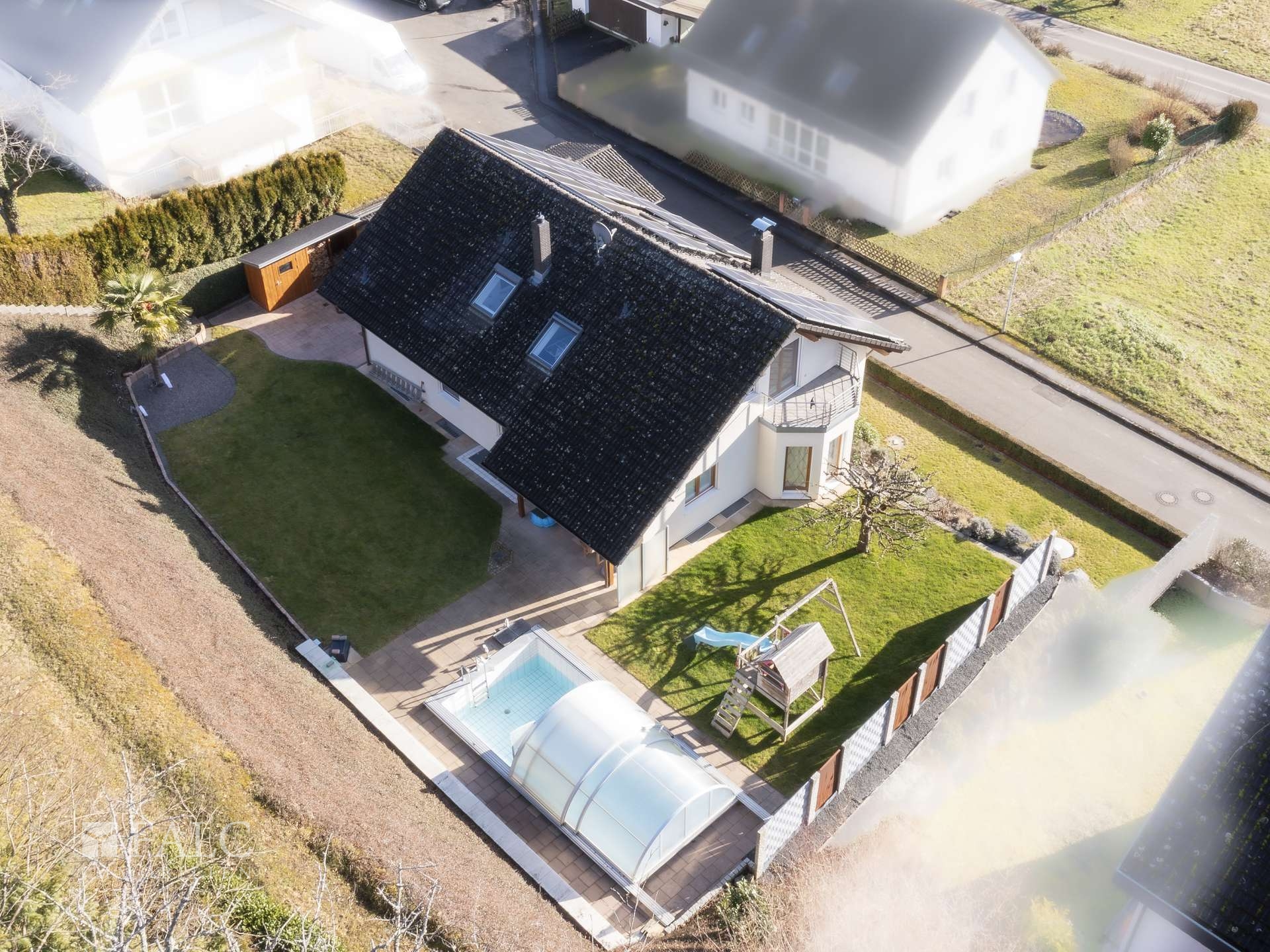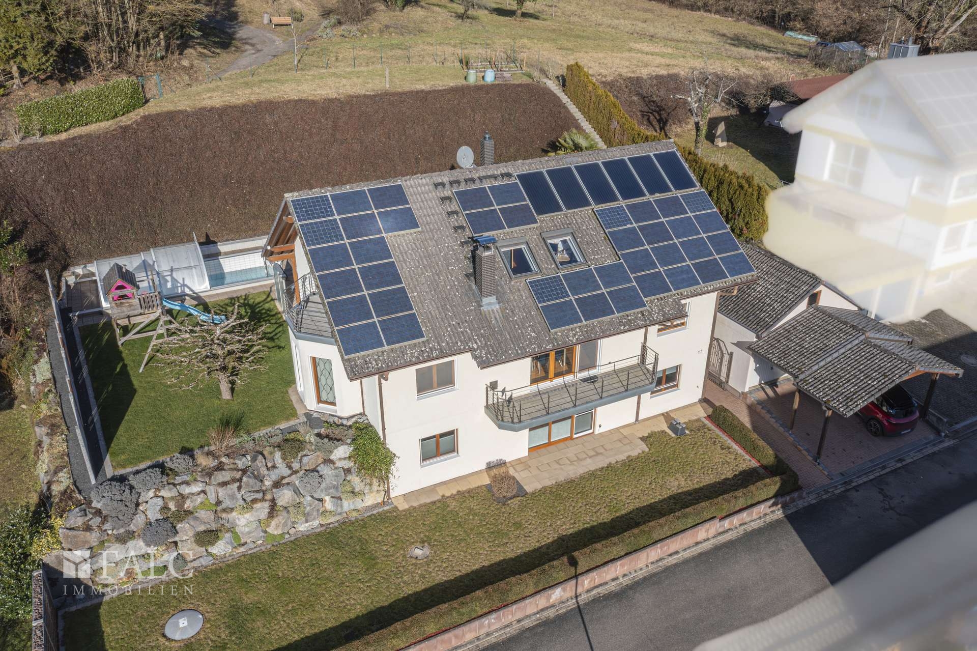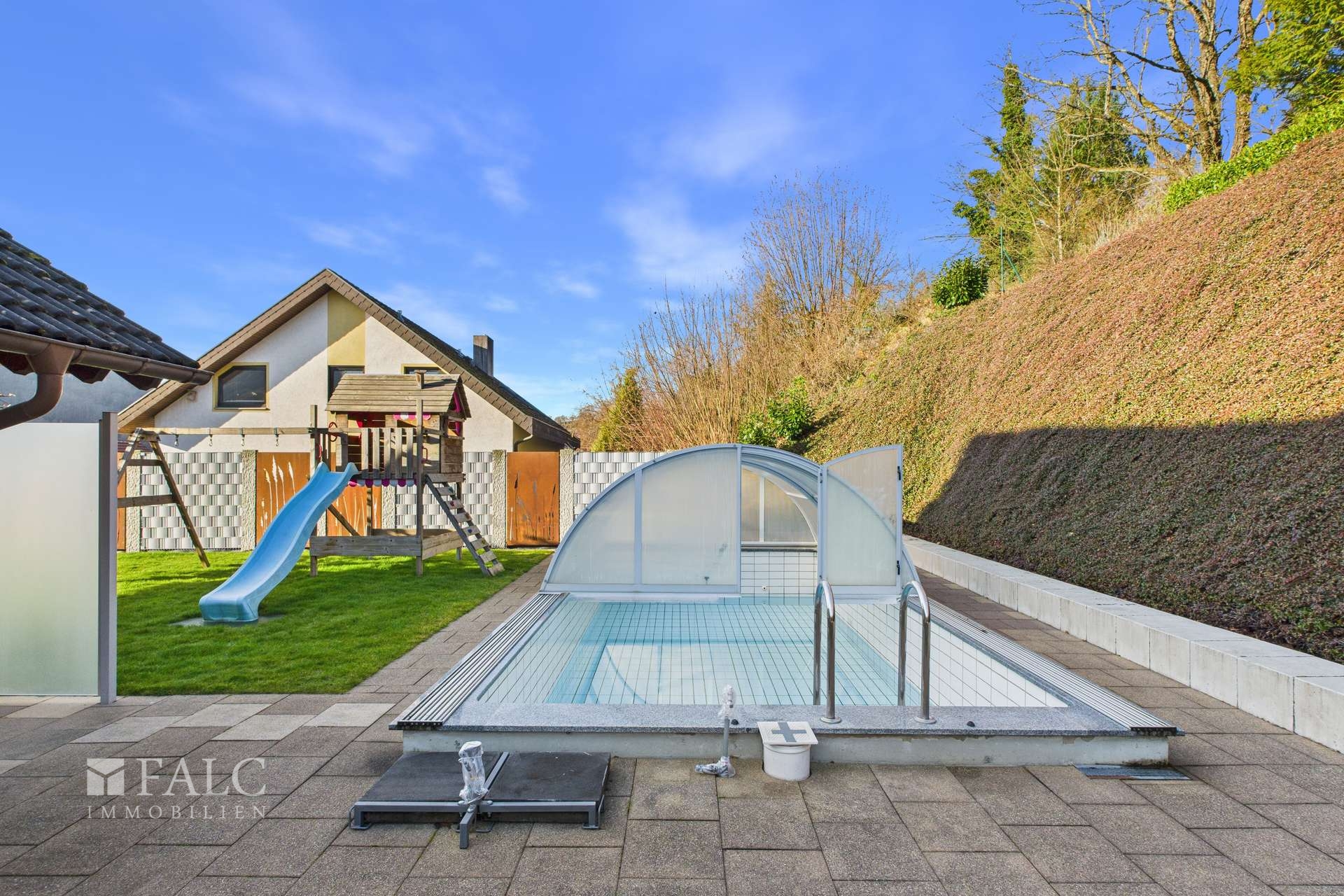 Der Garten lädt zum Spielen und Entspannen ein. Besonderes Highlight ist der überdachte, beheizte Pool mit Filteranlage, dessen Dach 2020 erneuert wurde. Eine Zisterne zur Bewässerung des gesamten Gartens sowie ein Sichtschutz aus Cortenstahl sorgen für Komfort und Privatsphäre.