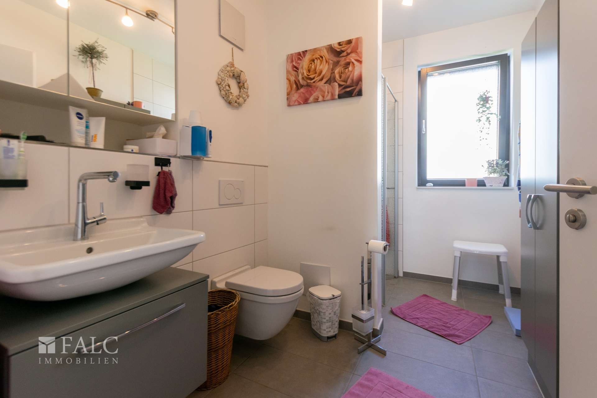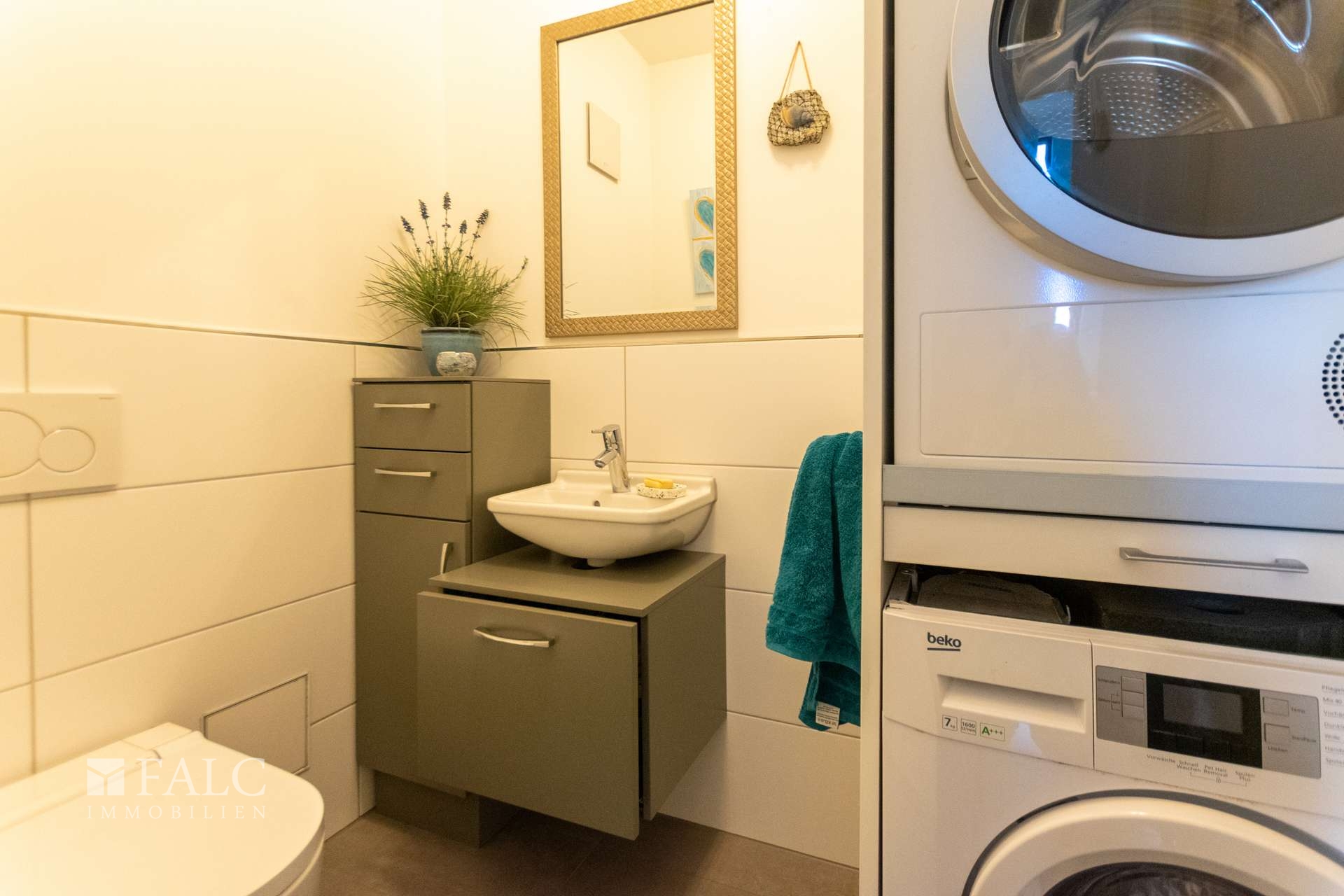 Das Tageslicht-Bad verfügt über eine begehbare Dusche mit Glastür, ein maßgefertigter Spiegelschrank über dem Waschbecken, ein WC sowie ein Handtuchwärmer sorgen für Komfort und Funktionalität. Das separate Gäste-WC ist mit einer elektrischen Dusch-WC-Funktion ausgestattet und bietet zudem Platz für Waschmaschine und Trockner. Beide Sanitärräume sind in einem eleganten Weiß-Grau gehalten, so dass Sie farbliche Akzente ganz nach Ihren Lieblingsfarben setzen können. Die jeweiligen Badmöbel sind bereits im Preis enthalten.
