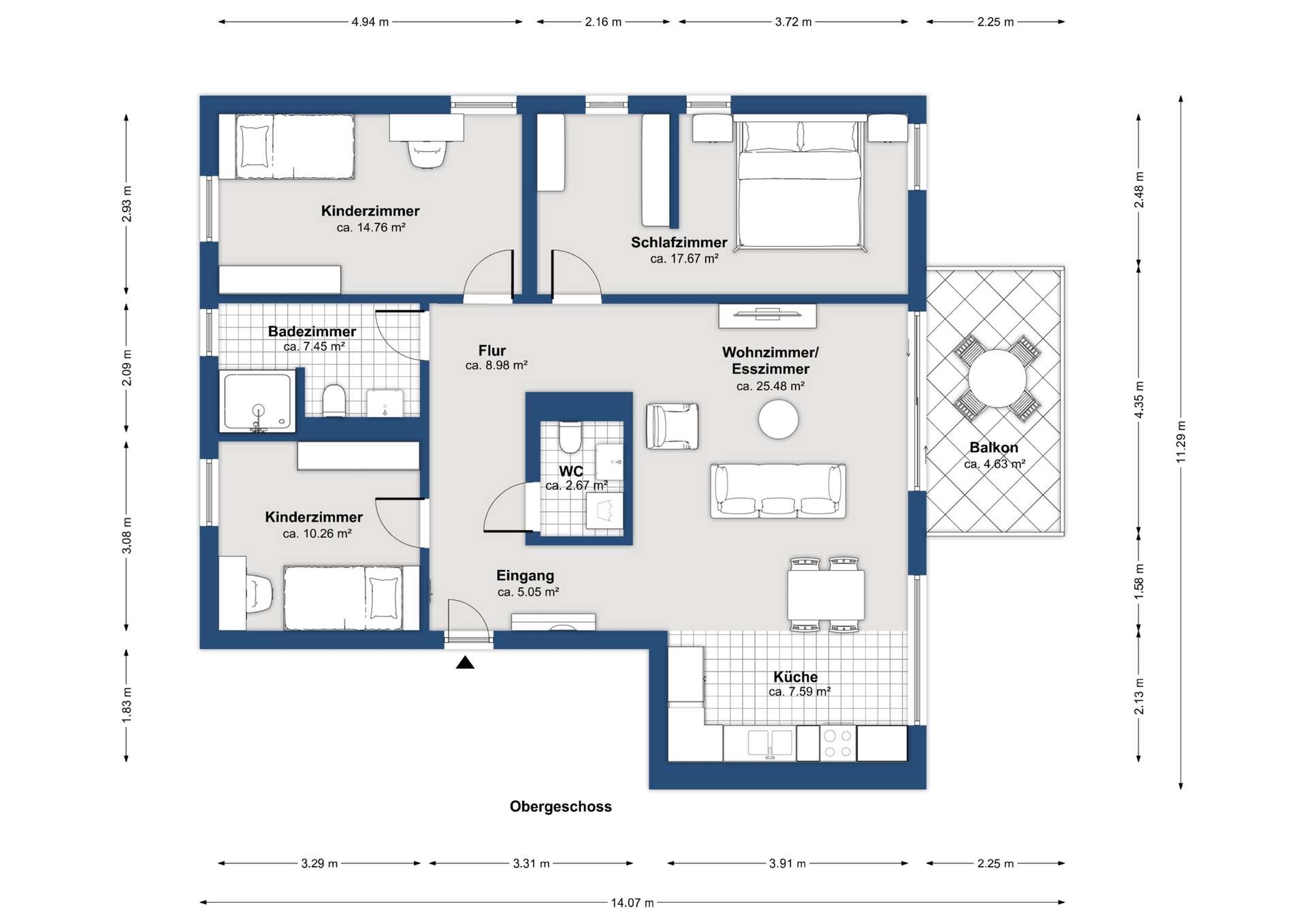 - zwei flexibel nutzbaren Kinder- oder Arbeitszimmern