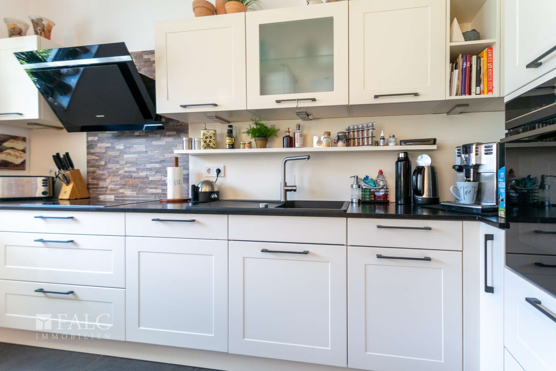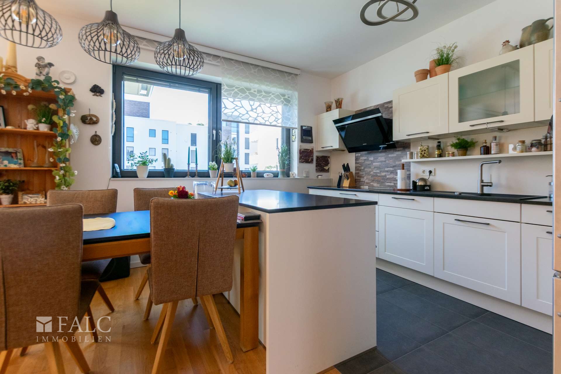 Das großzügig geschnittene Wohn- und Esszimmer bietet reichlich Platz zum Entspannen und zum Bewirten von Gästen. Die offen angeschlossene Küche ist hochwertig ausgestattet und lässt keine Wünsche offen: Siemens-Markengeräte wie Backofen mit Dampfgarerfunktion, Induktionskochfeld, Dunstabzugshaube, Geschirrspüler sowie ein Liebherr-Kühlschrank mit integrierter Eismaschine gehören zur Ausstattung und sind im Preis enthalten. Eine versenkbare, elektrische Brotschneidemaschine rundet das durchdachte Küchenkonzept ab.