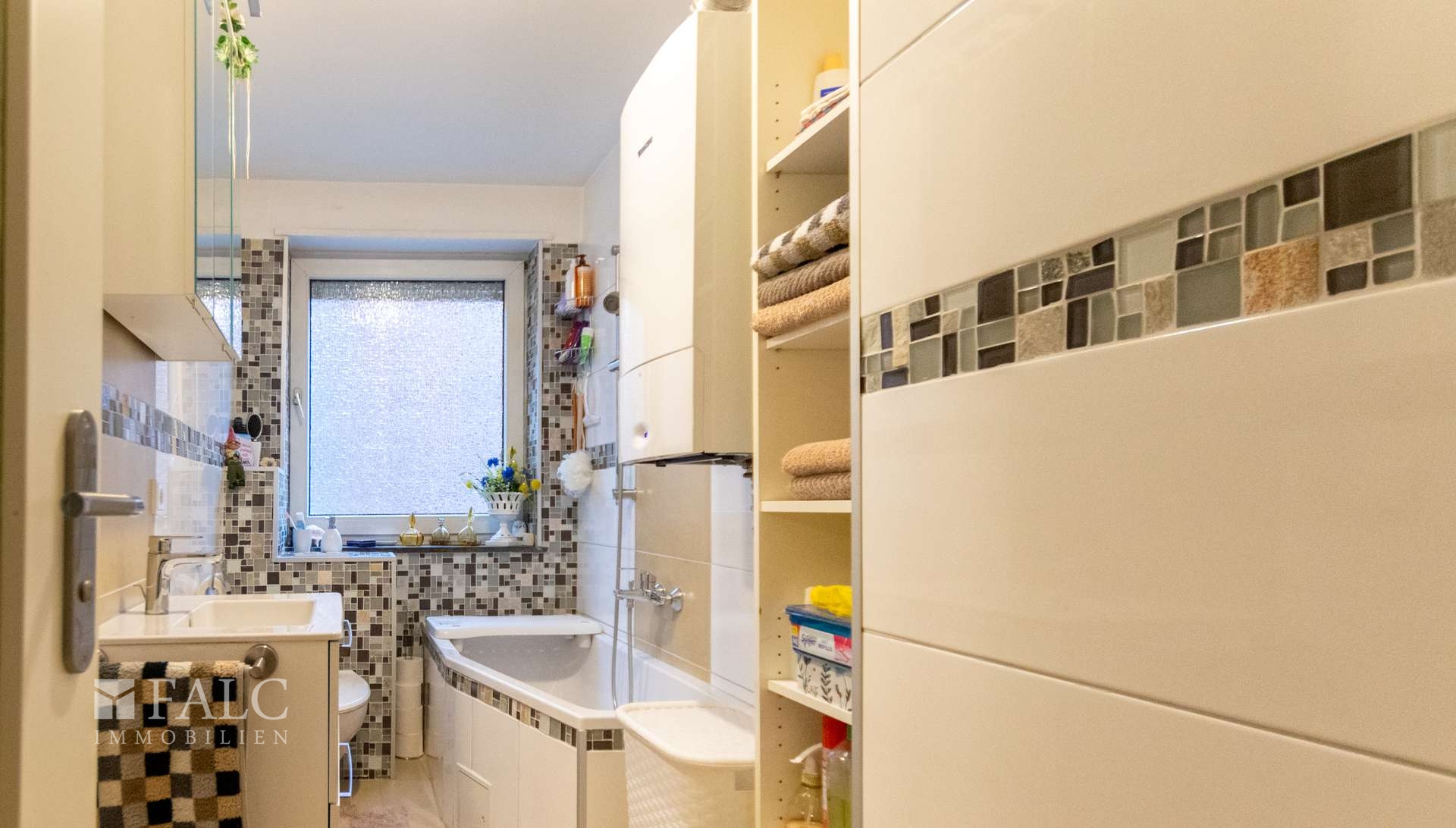 Das Badezimmer ist fast vollständig deckenhoch gefliest und überzeugt durch eine zeitlose, elegante Gestaltung in Weiß-, Grau- und Beigetönen. Zur Ausstattung gehören eine Badewanne, ein WC sowie ein Waschbecken mit praktischem Unterschrank, der zusätzlichen Stauraum bietet.