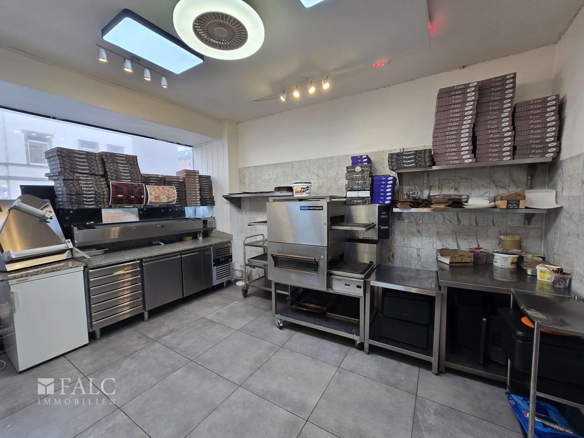 Zum Verkauf stehen zwei nebeneinanderliegende Ladenlokale an der Steeler Straße in Essen, jeweils ca. 50 m² groß. Eines der Lokale ist als moderne Küche mit vollständiger Ausstattung eingerichtet, das andere dient als Gastraum.