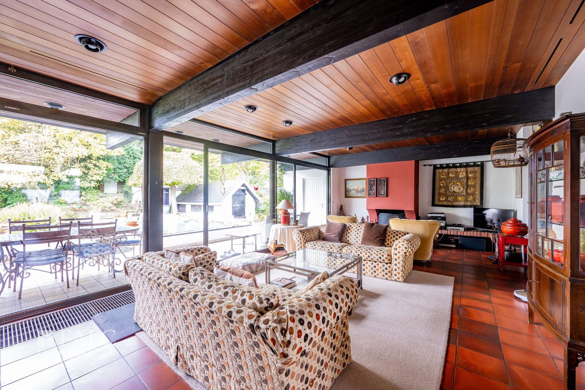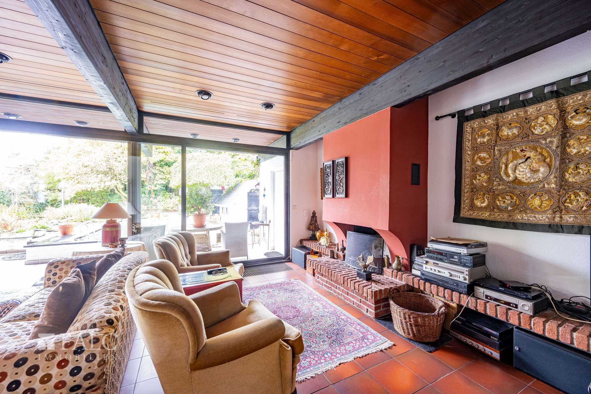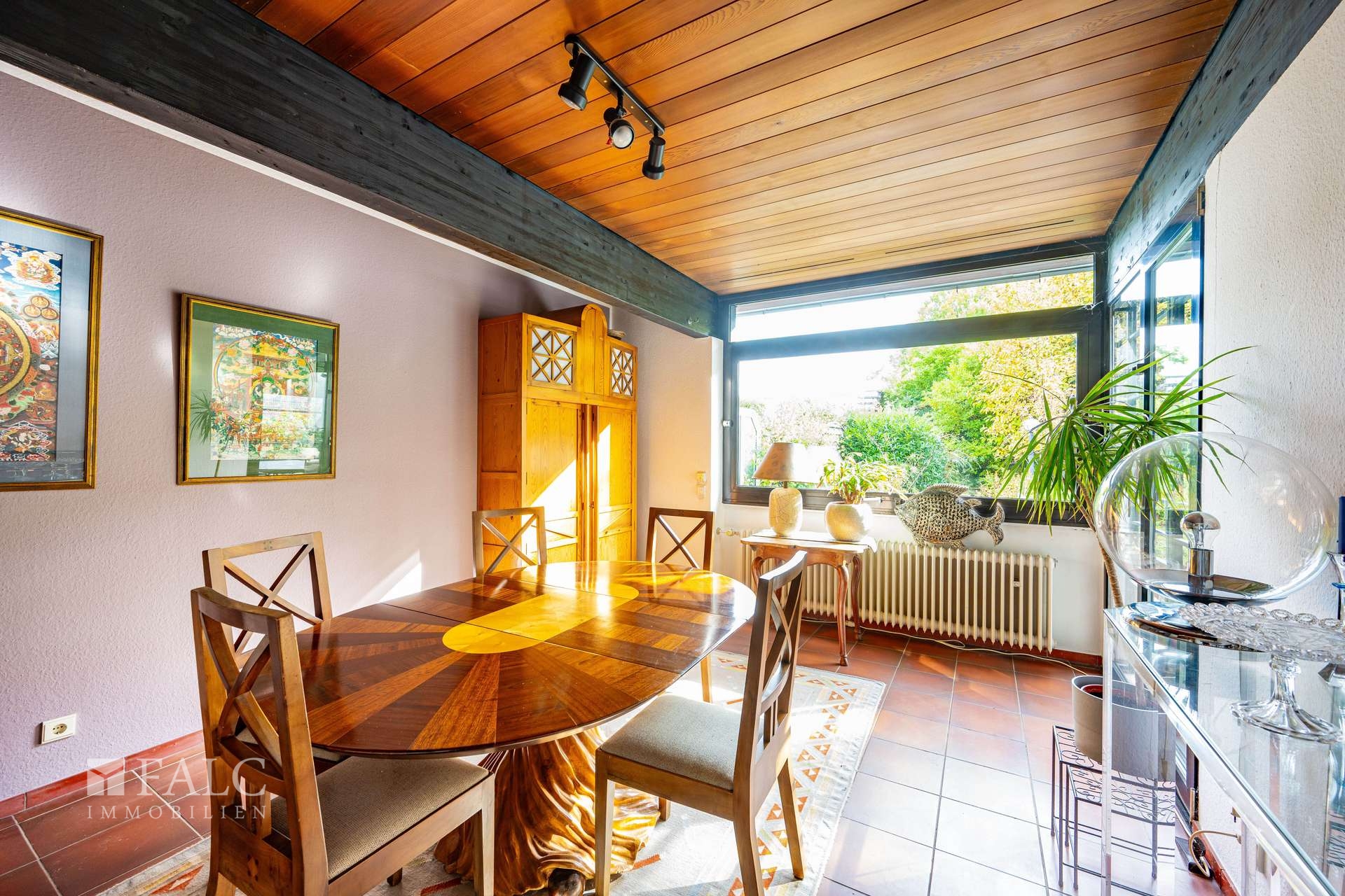 Weiter geht es in das geräumige Wohnzimmer, das durch große Fensterfronten viel Tageslicht und einen herrlichen Blick in den privat angelegten Garten bietet. Ein Kamin sorgt für gemütliche Abende. Vom Wohnzimmer aus haben Sie Zugang zur Terrasse. Der Garten selbst ist ein Highlight, perfekt für Familienaktivitäten und Entspannung im Freien.