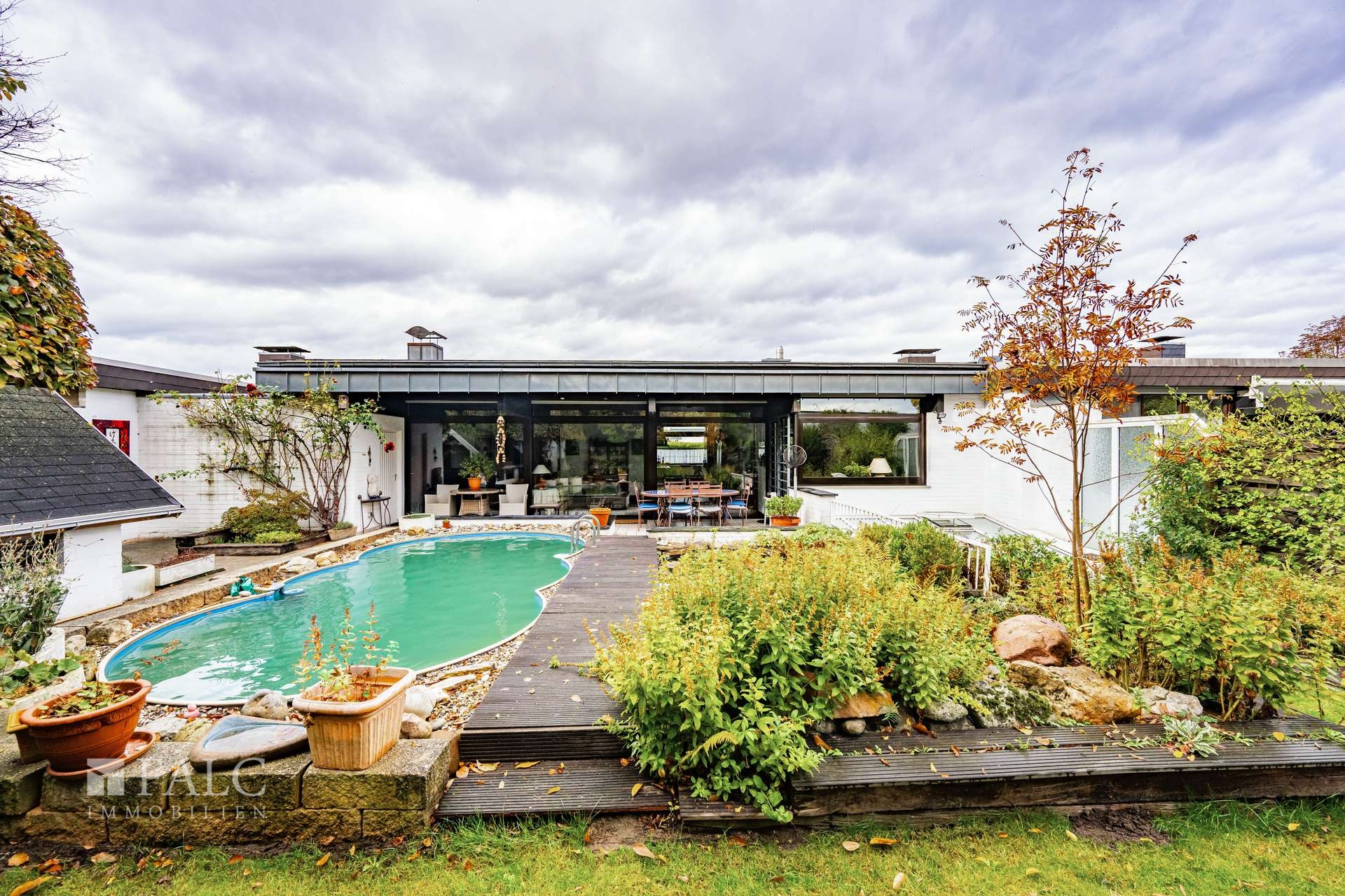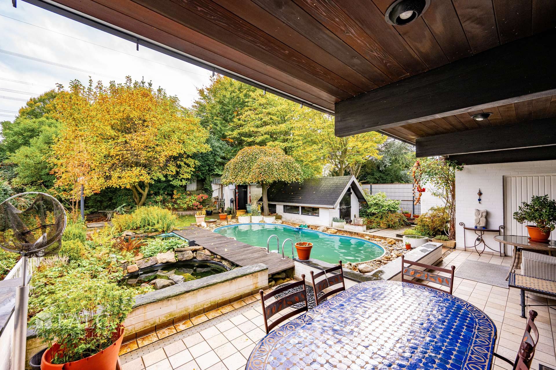 - Außenbereich mit Pool, zwei Teichen, Sitzbereichen, Abstellraum und Weinkeller