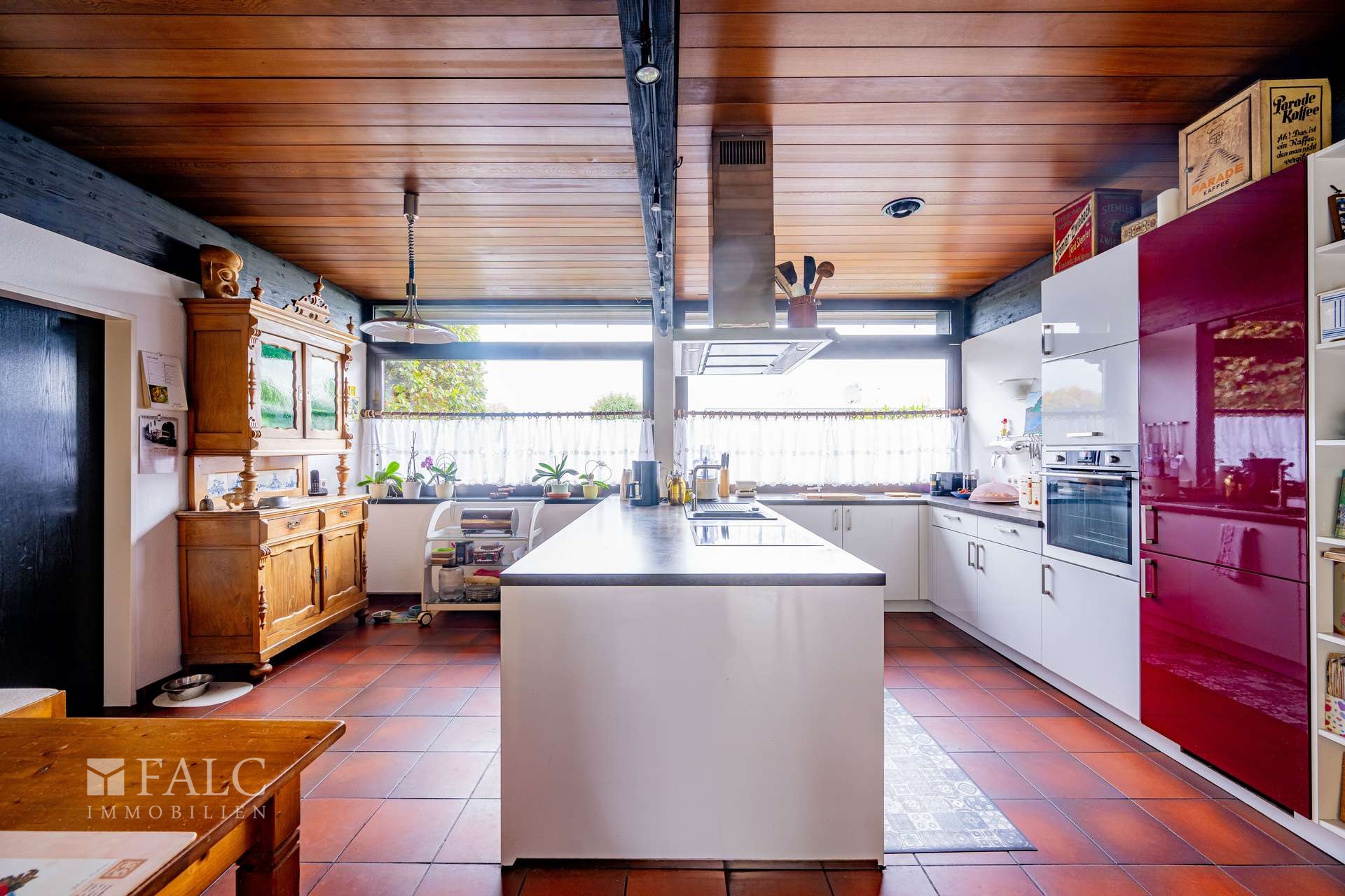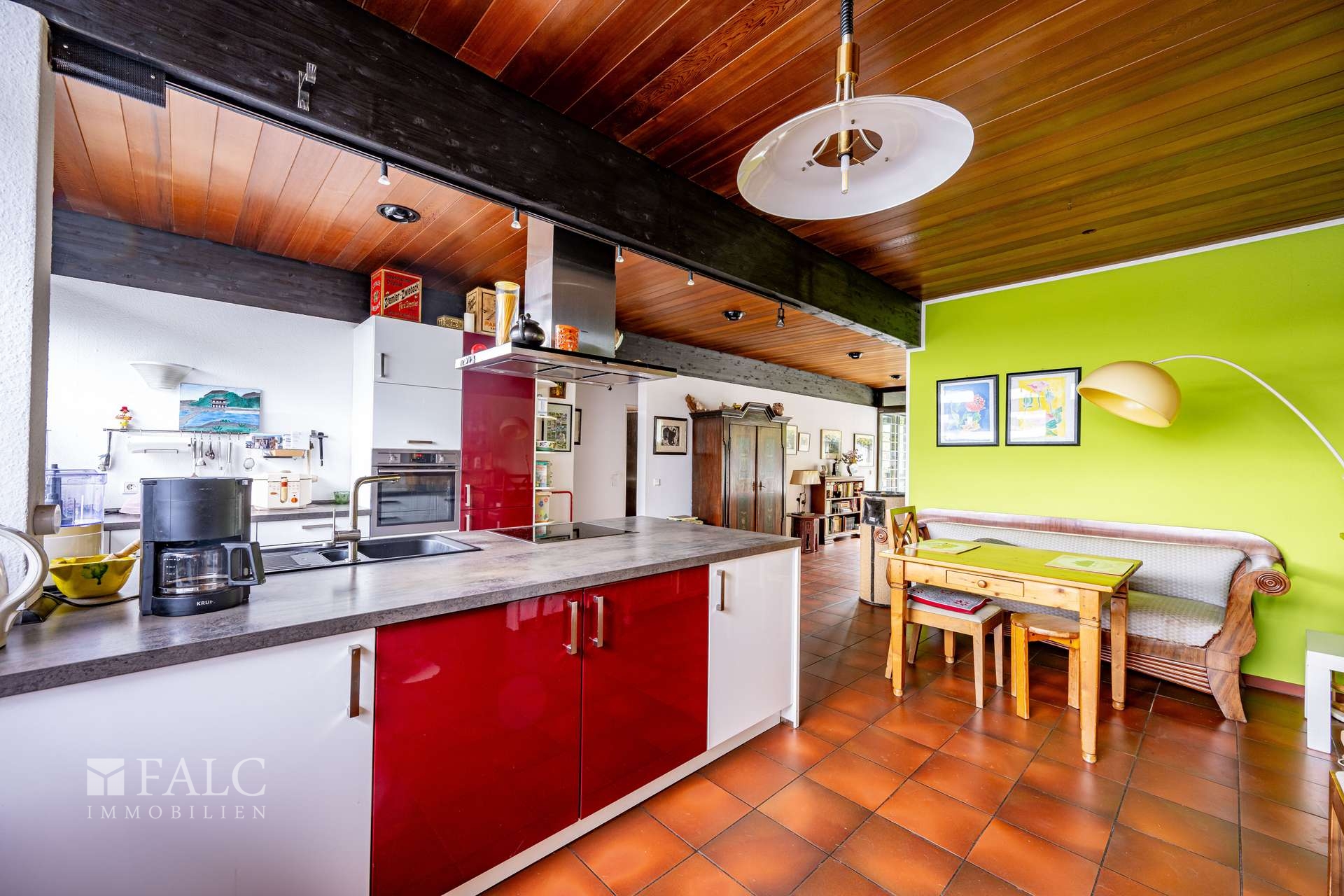 Die angrenzende, offen gestaltete Küche mit Essbereich bietet ausreichend Platz für gemeinsame Kochabende und ermöglicht gesellige Mahlzeiten mit der Familie und Freunden.