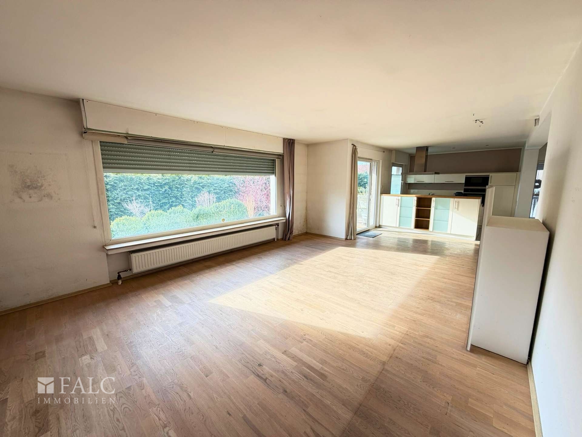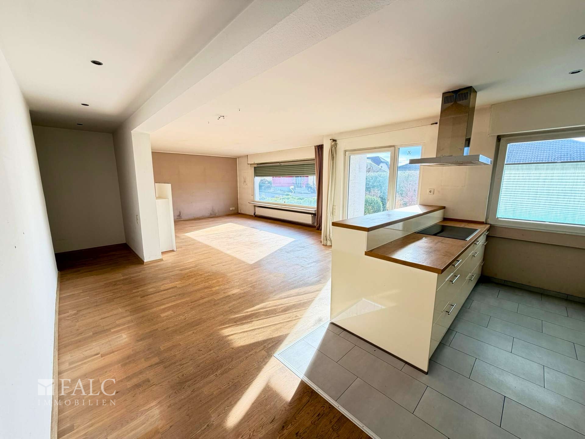 Der Wohnbereich wirkt großzügig und erhält durch große Fensterflächen viel Tageslicht. Die Küche ist in den Wohnbereich eingebunden und über eine Theke optisch gegliedert, was den Raum offen hält und gleichzeitig Struktur schafft. Von hier aus gelangen Sie direkt auf die Terrasse, die sich als natürlicher Erweiterungsraum für Mahlzeiten im Freien oder entspannte Nachmittage anbietet und den Übergang in den Garten angenehm gestaltet.