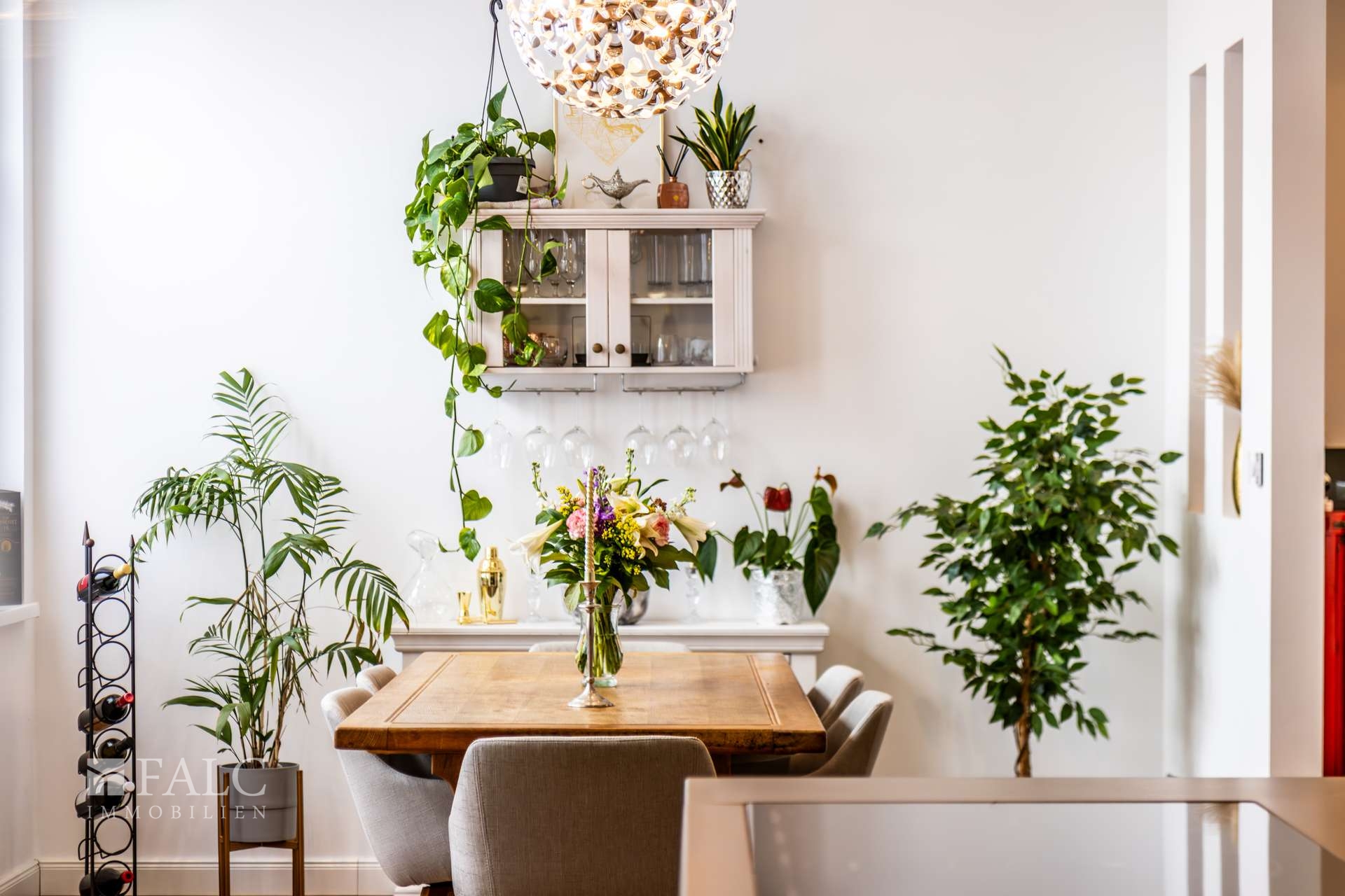 Der Außenbereich präsentiert sich mit einer schönen Terrasse, einem liebevoll gestalteten Innenhof sowie eigenen Stellplätzen und einer Garage – ideale Voraussetzungen für komfortables Wohnen.