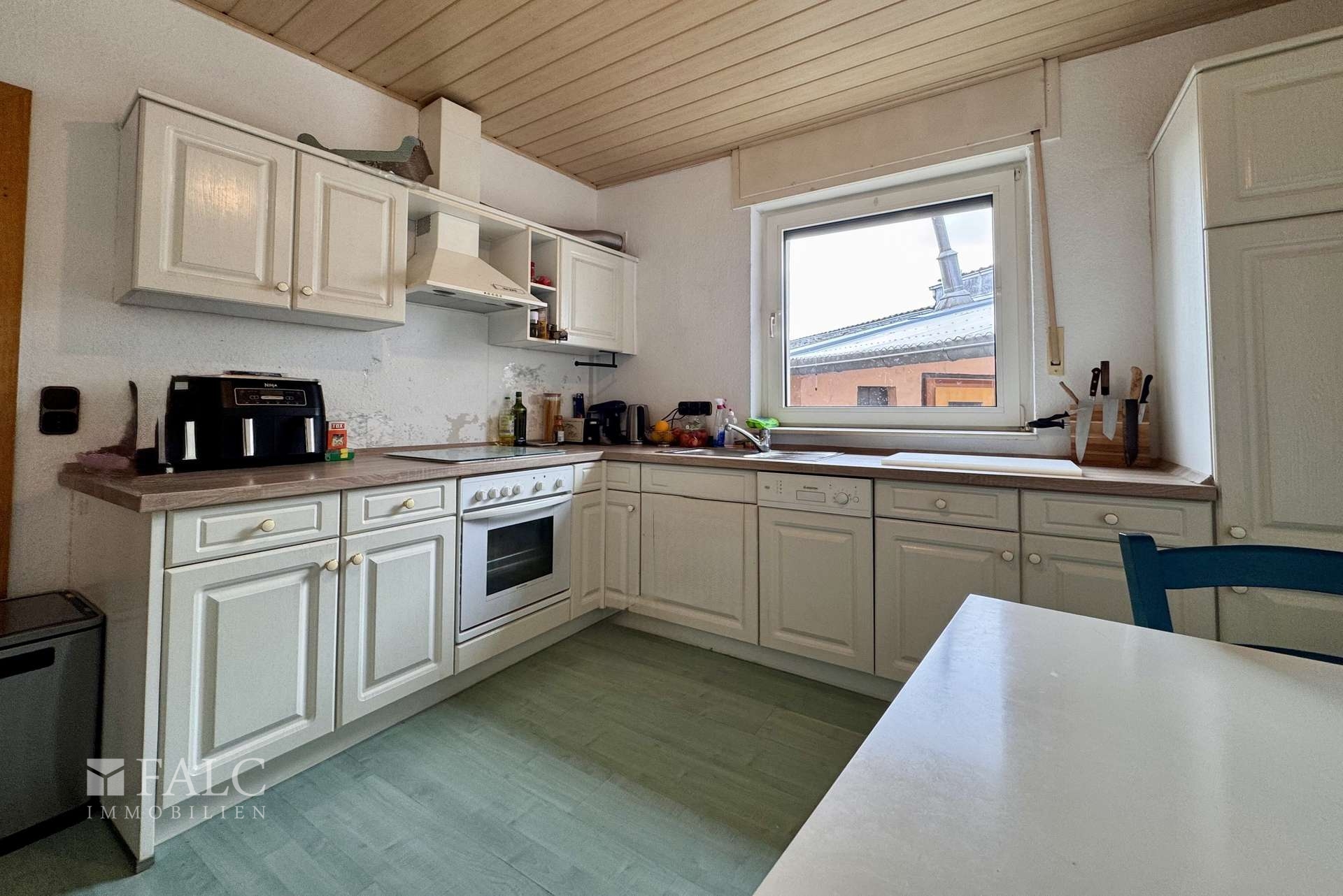 Früheres Ladenlokal, heute moderner Wohnraum mit offener Küche inkl. Essplatz, Gäste-WC, Schlafzimmer, Kinderzimmer, Bad mit Dusche und Badewanne.
