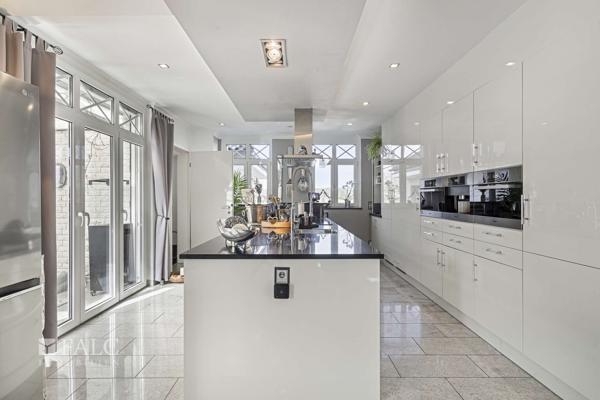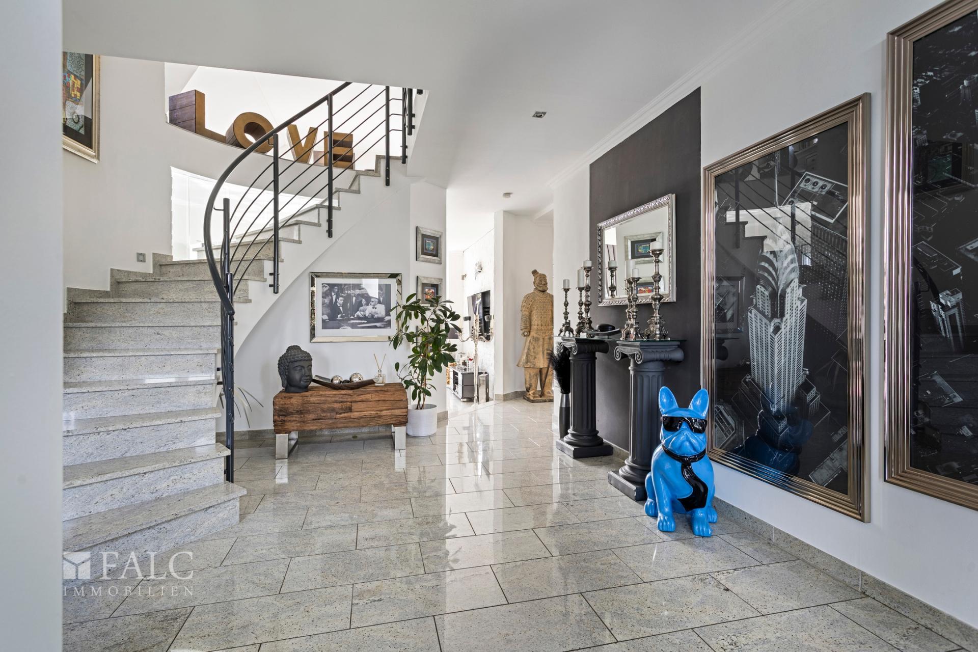 Bereits der Eingangsbereich vermittelt Weite und unterstreicht den repräsentativen Charakter des Hauses. Von hier aus öffnet sich der Blick in den großzügig gestalteten Wohn-, Ess- und Kochbereich, der das Zentrum des Hauses bildet. Die Galerie, die beeindruckenden Fensterflächen und der Kamin verleihen diesem Bereich eine besondere Präsenz und schaffen ein Ambiente, das Offenheit, Licht und Behaglichkeit auf harmonische Weise miteinander verbindet. Die hochwertige Einbauküche fügt sich stilsicher in das Gesamtbild ein und profitiert ebenso wie der Essbereich vom unmittelbaren Bezug zur gepflegten Gartenanlage.