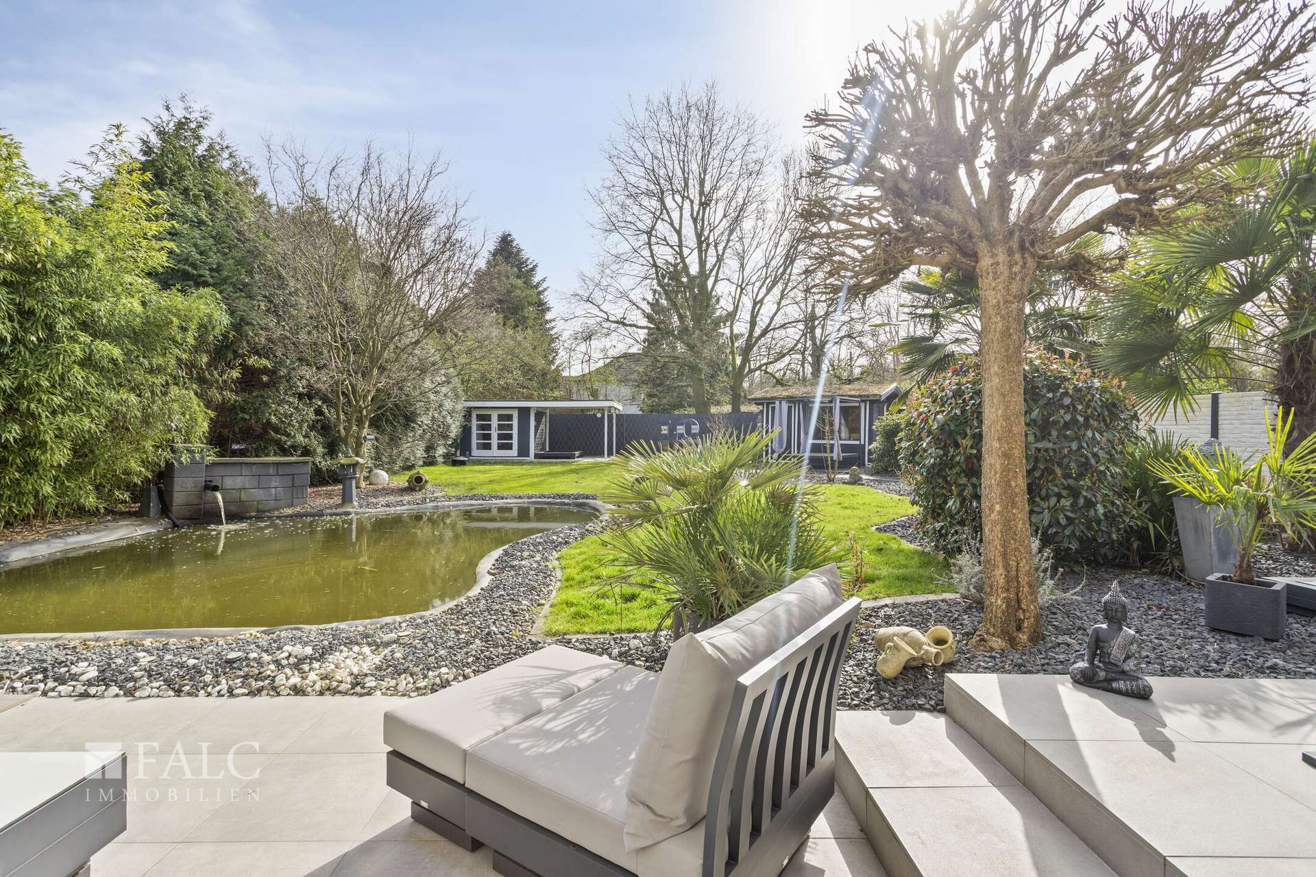 Besonders prägend ist der Außenbereich: Terrasse, Garten und die Teichlandschaft mit rund 30 Kois schaffen ein Umfeld mit spürbarer Ruhe und hoher Aufenthaltsqualität. Ein Gartenhaus mit integrierter Sauna ergänzt diesen Bereich sinnvoll und erweitert die private Rückzugsqualität des Hauses. Abgerundet wird das Gesamtbild durch komfortable Ausstattungsmerkmale wie Klimaanlage, elektrische Alu Sonnenrollläden, praktische Nutzflächen sowie eine Garage mit zusätzlichem Außenstellplatz.