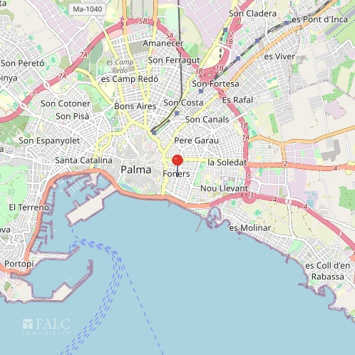 Die Wohnung liegt im Stadtteil Foners, einem sehr zentralen und gut angebundenen Quartier östlich der Altstadt von Palma. Die Zone kombiniert städtisches Leben, schnelle Wege zum Meer und eine komplette Infrastruktur direkt vor der Haustür.