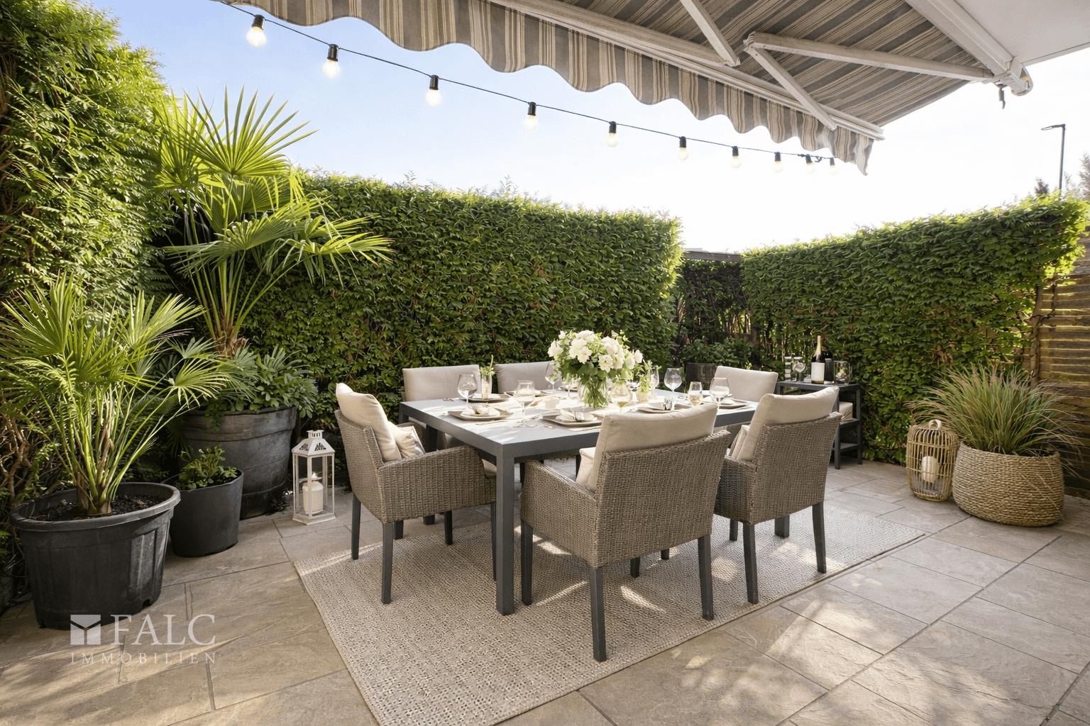 • Terrasse mit Fliesenbelag, Sichtschutz und Pflanzenkästen
