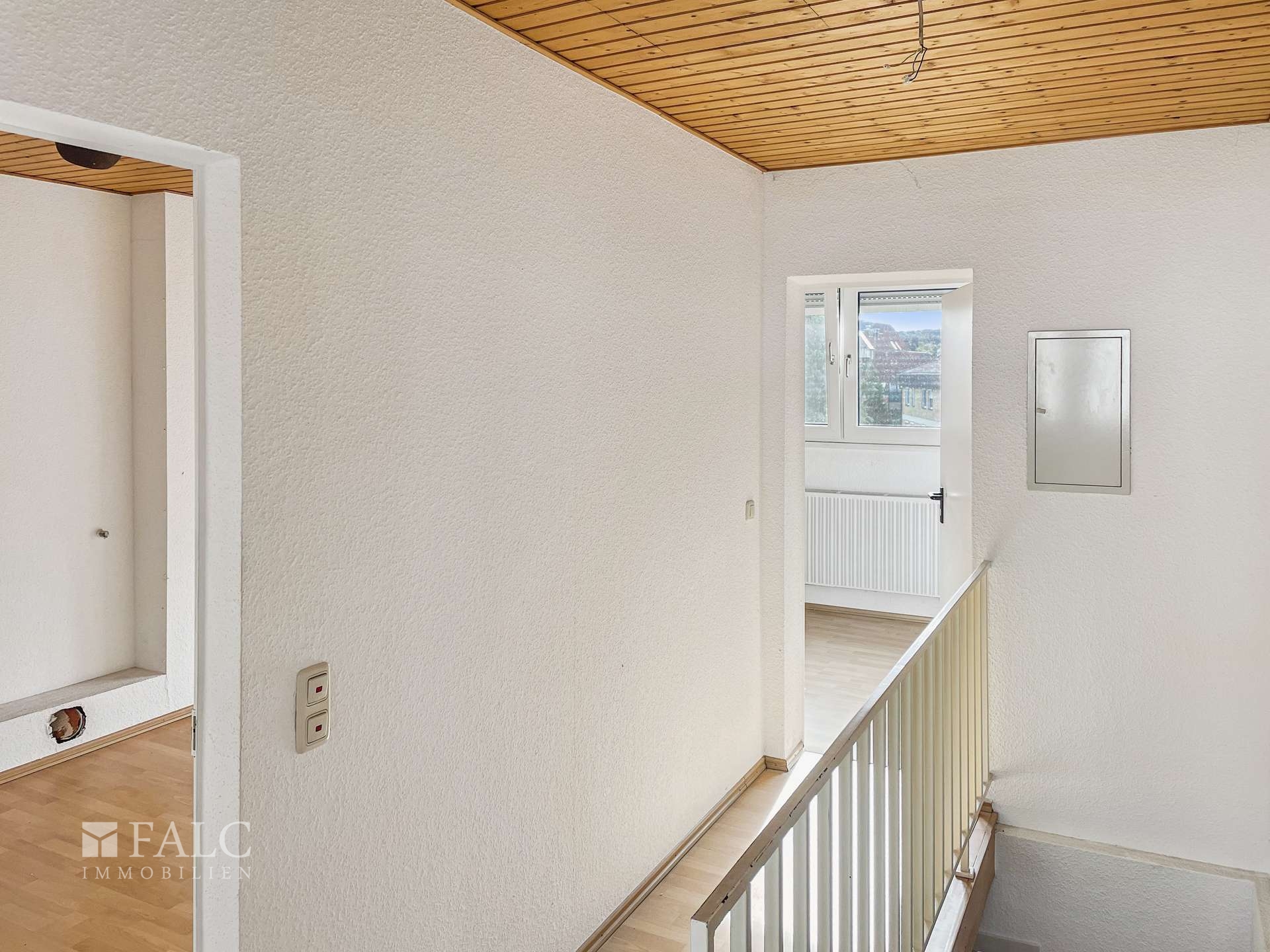 Über eine innenliegende, moderne Holztreppe gelangt man in das ausgebaute Dachgeschoss mit zwei Zimmern und einem Koch- und Essbereich.