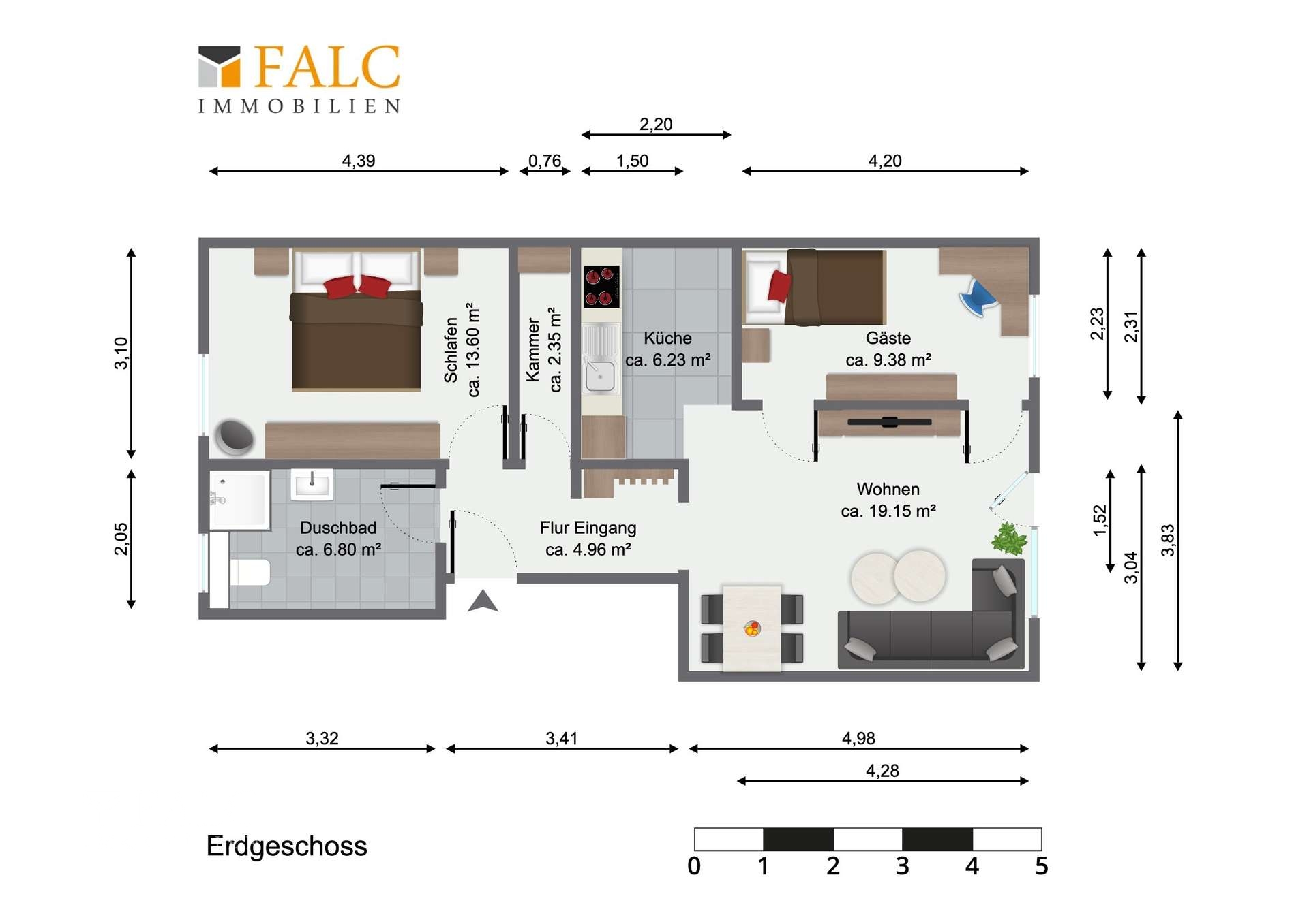 - 3 Zimmer (Wohn-/Essbereich, Schlafzimmer, Gästezimmer/Büro)