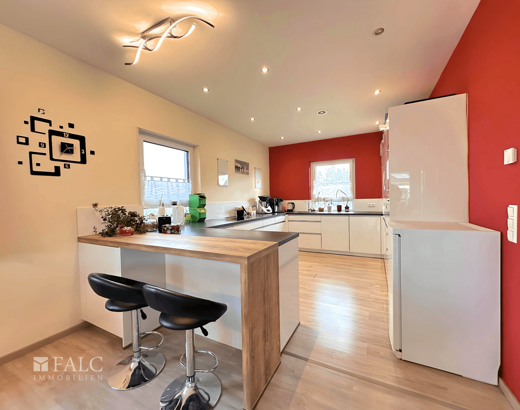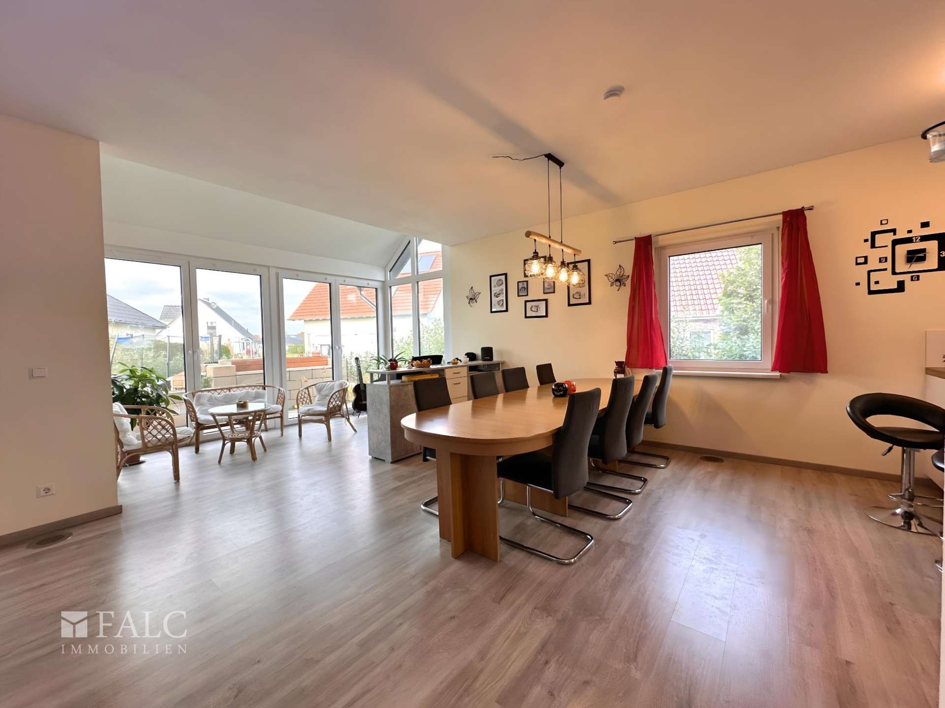 Im Erdgeschoss befindet sich ein moderner, offener Küchen- und Essbereich, der durch eine maßgefertigte Einbauküche und eine großzügige Raumgestaltung beeindruckt. Die Küche erfüllt die höchsten Ansprüche an Funktionalität und Design und ist mit hochwertigen Geräten ausgestattet, die das Kochen zu einem Erlebnis machen. Der Essbereich, der in einen charmanten Erker übergeht, bietet viel Platz für Familienmahlzeiten oder das stilvolle Bewirten von Gästen. Durch die große Fensterfront fällt reichlich Tageslicht in den Raum, was für eine warme und einladende Atmosphäre sorgt. Das Erdgeschoss verfügt außerdem über ein modernes Gäste-WC – ein praktisches Detail, das den Komfort für Gäste und Bewohner gleichermaßen erhöht.