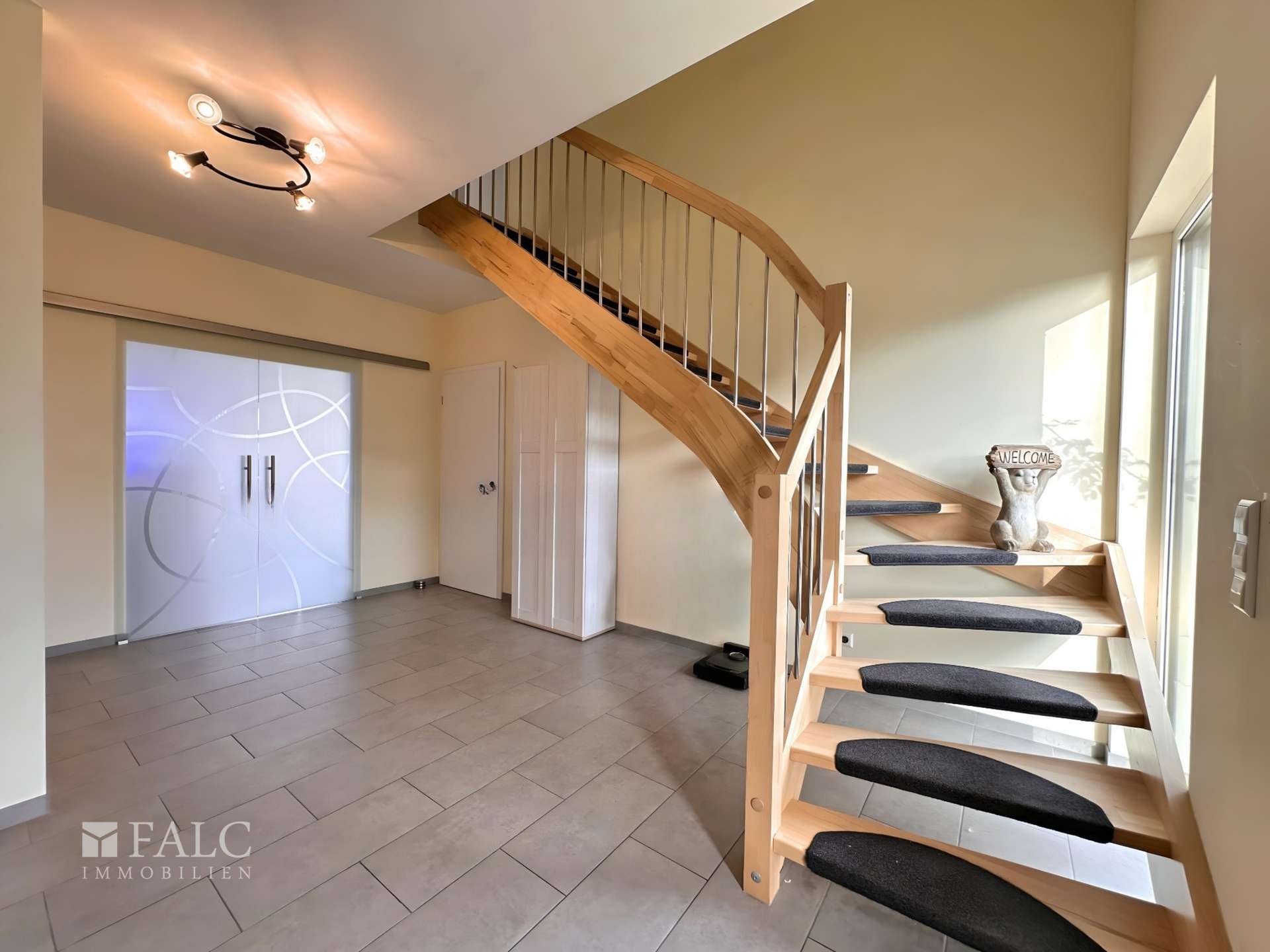 Bereits beim Betreten des Hauses fällt der große, offene Eingangsbereich ins Auge, der durch hohe Decken und eine elegante Gestaltung besticht. Dieser Bereich führt nahtlos in den großzügigen und lichtdurchfluteten Wohnbereich über, der den idealen Rahmen für stilvolle Wohnideen und eine einladende Atmosphäre schafft. Die gehobene Ausstattung und hochwertige Materialwahl zieht sich konsequent durch das gesamte Haus und unterstreicht den exklusiven Charakter dieser Immobilie.