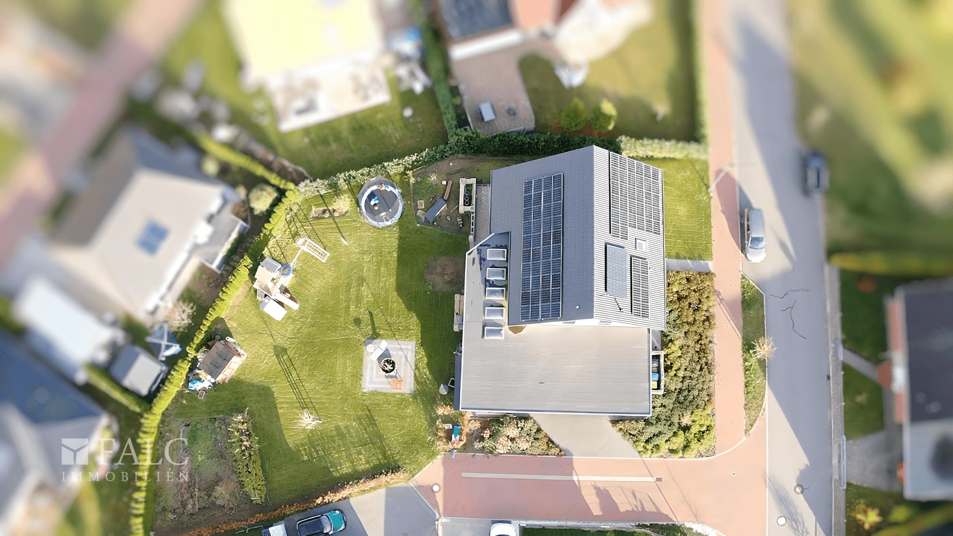Besonders hervorzuheben ist die moderne Photovoltaikanlage auf dem Dach, die mit einer Leistung von 15,2 kWp und einem 10-kW-Speicher sowie einer Wallbox zur Aufladung von Elektrofahrzeugen ausgestattet ist. Diese nachhaltige Technologie trägt nicht nur zur Schonung der Umwelt bei, sondern hilft auch, Energiekosten zu senken und das Haus zukunftssicher zu machen.