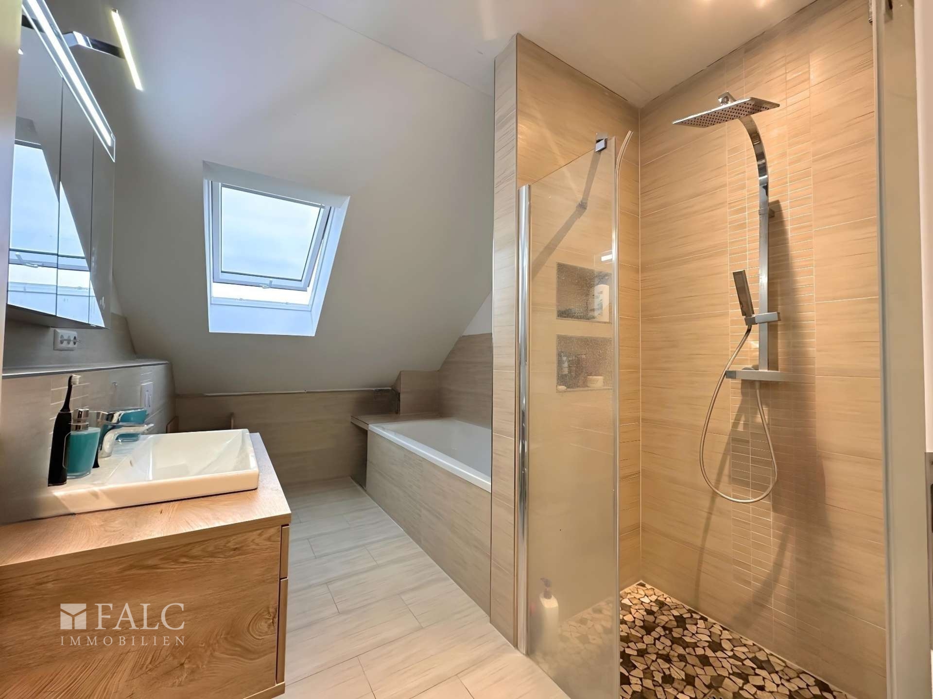 Das Vollbad in diesem Einfamilienhaus bietet eine gelungene Kombination aus stilvollem Design und Funktionalität, die den Raum in eine persönliche Wellness-Oase verwandelt. Ausgestattet mit einer modernen, großzügigen Dusche und einer komfortablen Badewanne, lädt dieses Badezimmer sowohl zu schnellen Erfrischungen am Morgen als auch zu ausgiebigen Entspannungsmomenten am Abend ein.