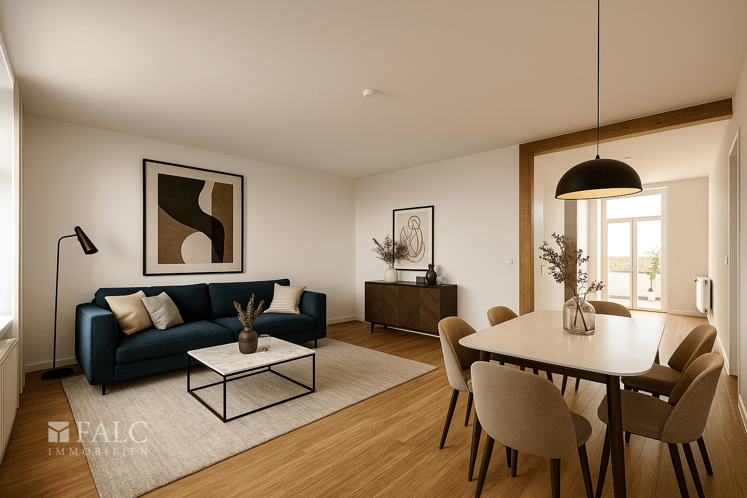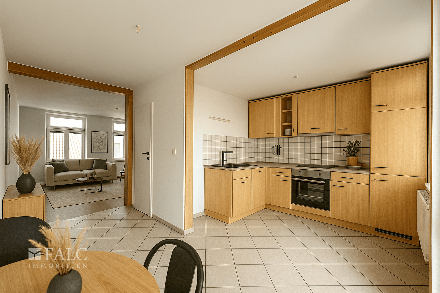 Rechts vom Eingangsbereich öffnet sich der weitläufige Wohn-, Küchen- und Essbereich, der mit seiner offenen Gestaltung den Mittelpunkt des täglichen Lebens bildet. Die Einbauküche ist harmonisch integriert und wird durch eine kleine Speisekammer ergänzt, die ebenso als Hauswirtschaftsraum genutzt werden kann. Vom Wohnbereich aus gelangt man direkt auf den großen, etwa 9 m² umfassenden Balkon mit angenehmer Südostausrichtung, der viel Morgen- und Vormittagssonne bietet und einen idealen Platz zum Entspannen schafft.