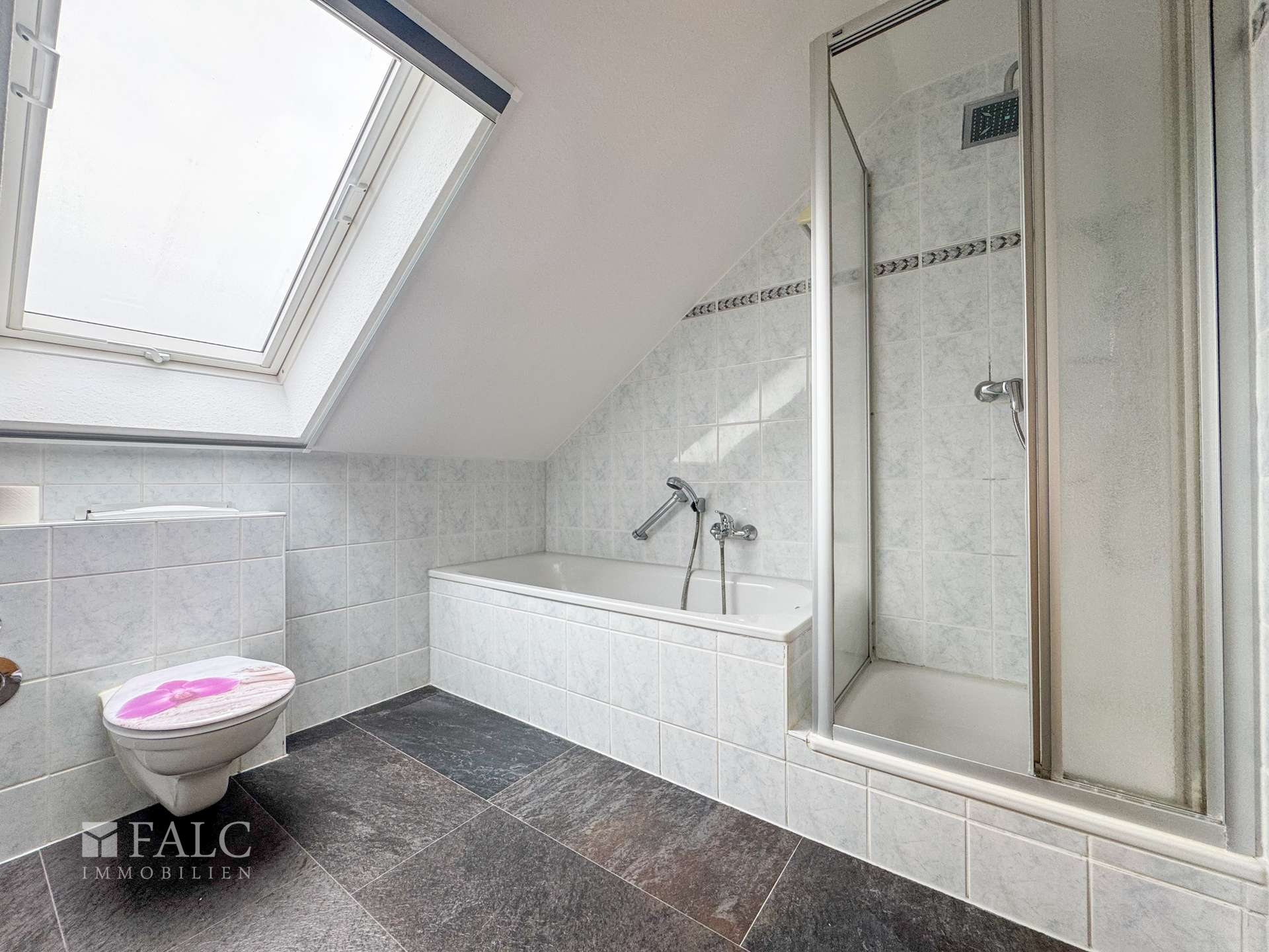 Das Badezimmer ist mit einer Badewanne und einer separaten Dusche ausgestattet. Die hellen Fliesen und das Tageslicht durch das Fenster schaffen eine angenehme Wohlfühlatmosphäre.