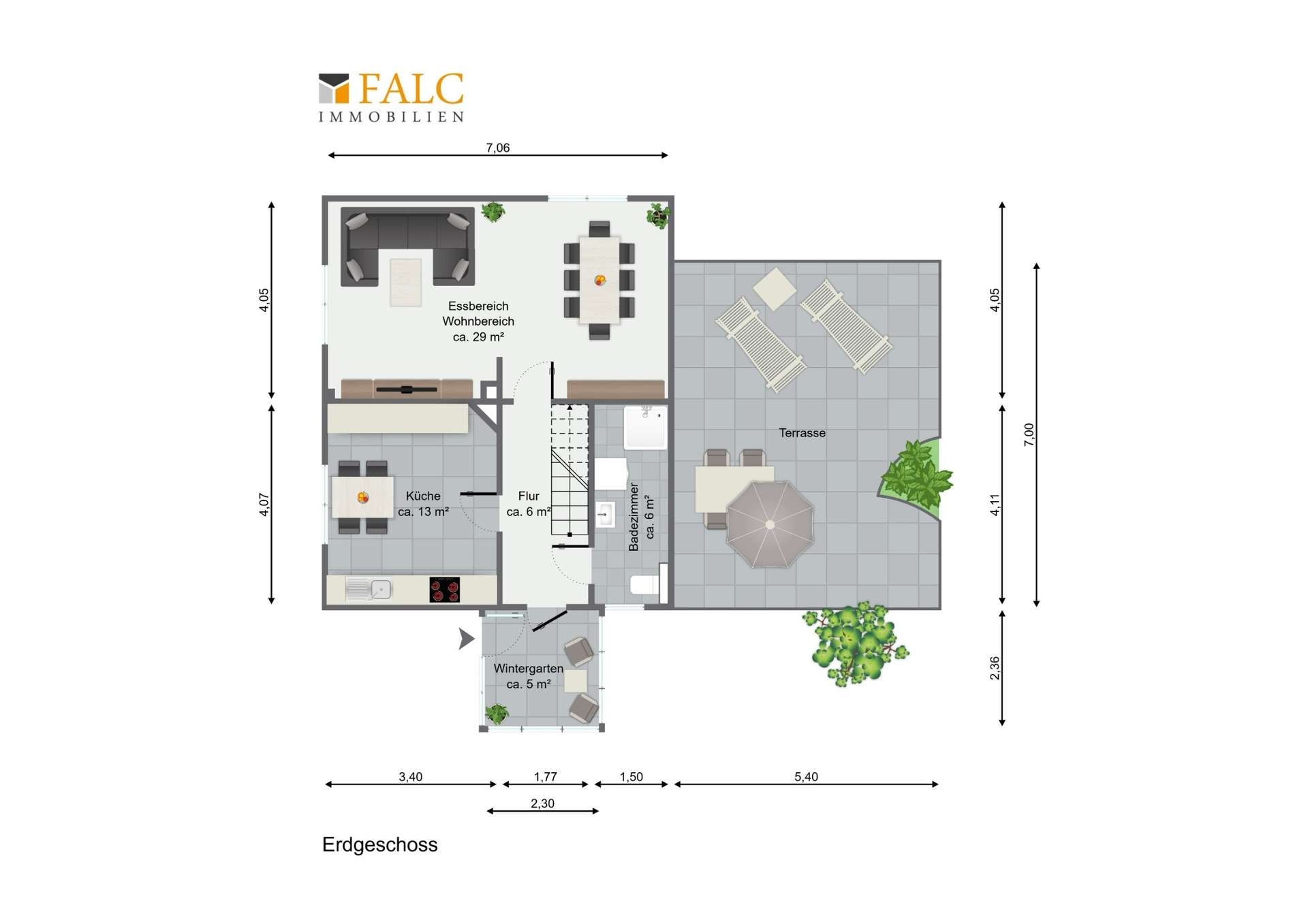 Im Erdgeschoss bildet der ca. 29 m² große Wohn- und Essbereich das Herzstück des Hauses. Durch seine Helligkeit und Großzügigkeit entsteht eine angenehme Wohnatmosphäre – ein freier Kaminabzug ermöglicht Ihnen zudem die Installation eines Kamins für noch mehr Wohnkomfort.