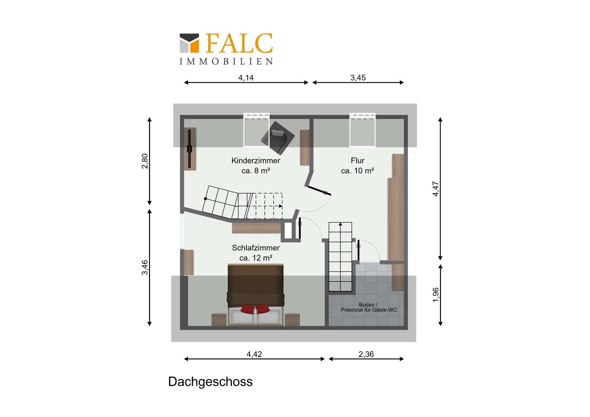 Zur Info, aufgrund der 3D-Perspektive wirken die Räumlichkeiten in der Regel etwas kleiner als in der Realität vor Ort.