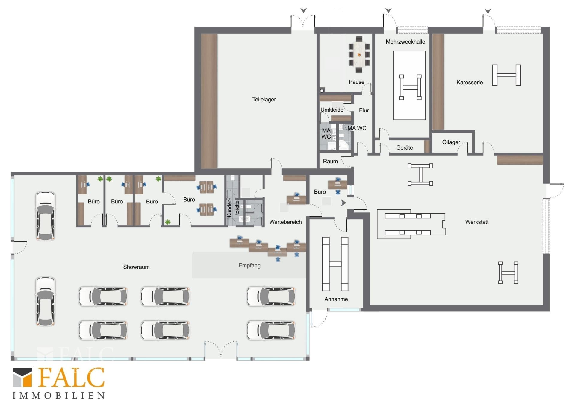 Vom Showroom aus erreichen Sie drei Verkaufsbüros, das Chefbüro mit Vorzimmer sowie ein Meisterbüro. Letzteres führt direkt in die rund 38 m² große Direktannahme mit Viersäulen-Hebebühne und Rolltor. Angeschlossen daran befindet sich die ca. 400 m² große Werkstatt. Sie ist mit drei Hebebühnen (jeweils 2 Säulen) sowie einer Vermessungsbühne (4 Säulen) mit Grube ausgestattet. Ein großes Rolltor ermöglicht hier ein bequemes Ein- und Ausfahren. Der Boden vor der Werkstatt ist versiegelt, sodass Öl oder Waschwasser problemlos aufgefangen werden können.