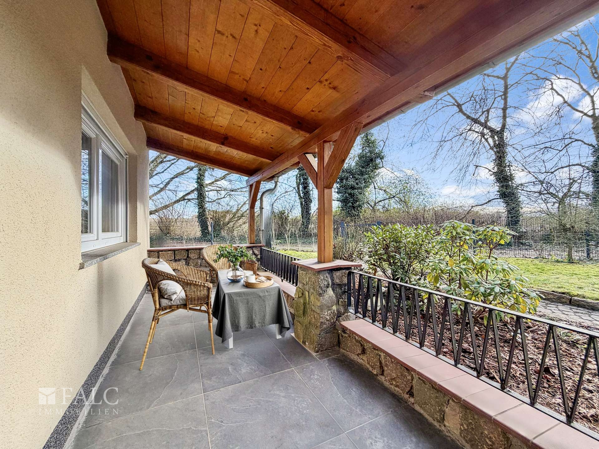 Die Einrichtung (außer Kamin) des Wohnzimmers und der Terrasse wurde digital gestaltet. Die Beschaffenheit der Räume ist auf den Bildern komplett original belassen.