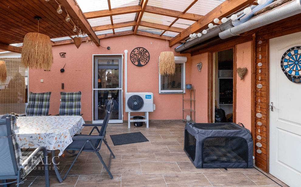 Zum Haus gehört ein vollständig eingezäuntes Grundstück von etwa 1.400 m². Der gepflegte Garten ist teilweise gepflastert und verfügt über einen überdachten Carport, der bequemes Parken ermöglicht. Ein besonderes Highlight des Außenbereichs ist die 28 m² große überdachte Terrasse, die sich ideal für Entspannung, Familienessen oder Treffen mit Freunden eignet.